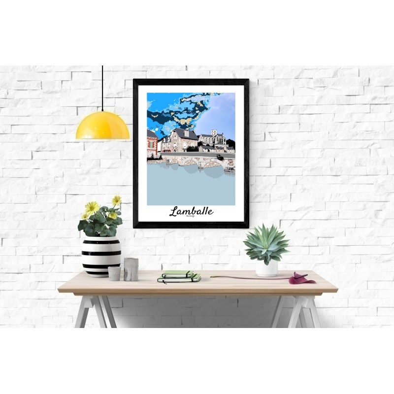 Réalisée dans un style graphique coloré façon bande dessinée, cette affiche décorative bretonne restitue l’harmonie entre patrimoine architectural et cours d’eau, pour un rendu à la fois dynamique et poétique.