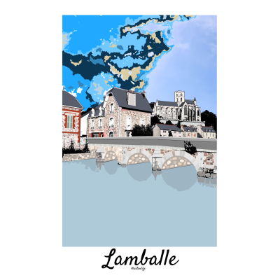 Cette affiche illustrée du Pont du Bourg Hurel à Lamballe, dans les Côtes-d’Armor en Bretagne, met en lumière le charme graphique et architectural de la ville. La rivière du Gouessant serpente sous le pont en granit de pierre, reflétant les couleurs douces de l’eau et la lumière du ciel.