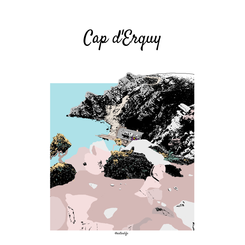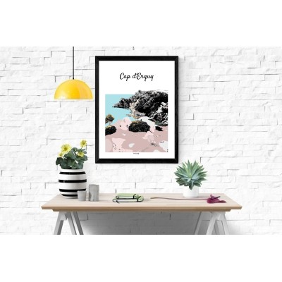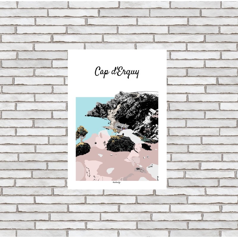 Cette affiche illustrée du Cap d’Erquy, sur la Côte de Penthièvre dans les Côtes-d’Armor en Bretagne, met en scène l’un des paysages les plus emblématiques du littoral breton. Au premier plan, le chemin côtier aux teintes terracotta, ponctué de cailloux, d’arbustes verts et jaunes, guide naturellement le regard vers l’horizon marin.