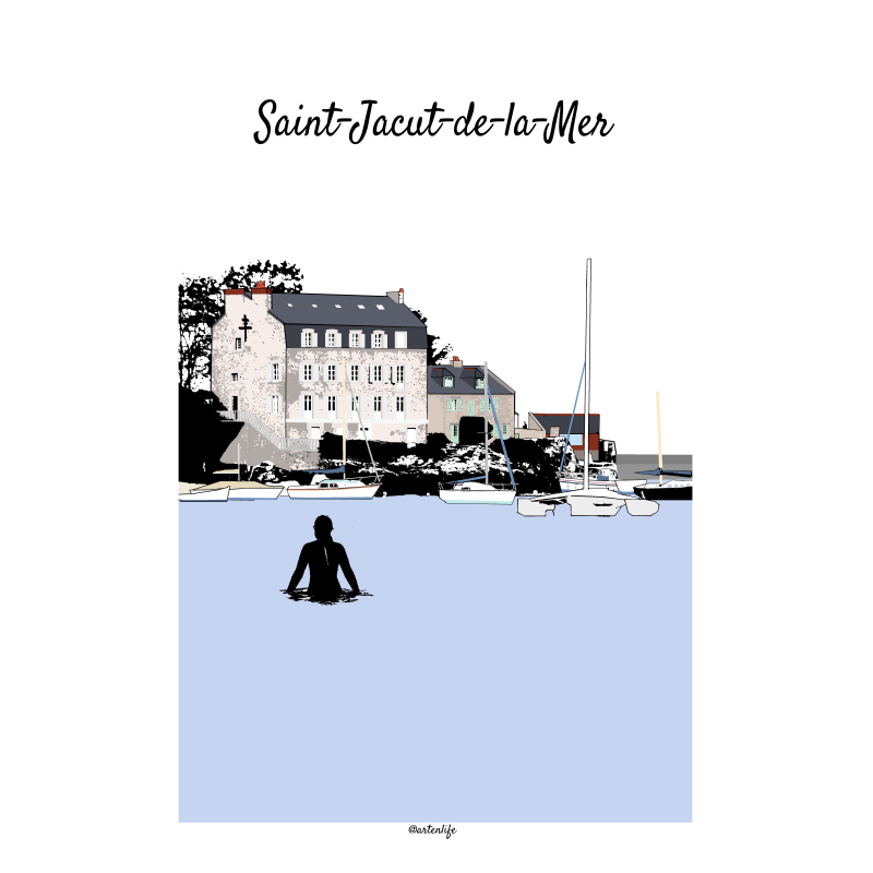 Cette affiche illustrée du port du Châtelet à Saint-Jacut-de-la-Mer, dans les Côtes-d’Armor en Bretagne, capture l’harmonie entre vie maritime, architecture traditionnelle et instants de bien-être. La scène s’ouvre sur une mer bleutée paisible, où stationnent plusieurs bateaux de plaisance majoritairement blancs, rehaussés de fines touches colorées sur leurs coques.