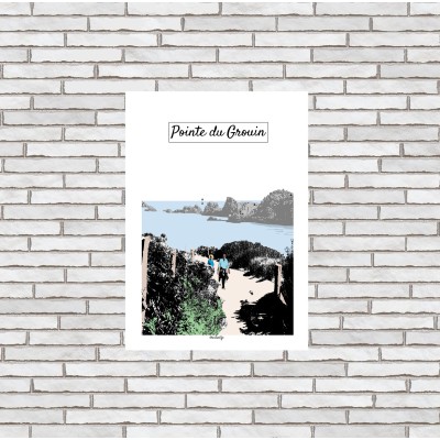 Cette affiche illustrée de la Pointe du Grouin à Cancale, en Ille-et-Vilaine en Bretagne, met en lumière l’un des panoramas les plus spectaculaires du littoral breton. Depuis le chemin côtier aux teintes sableuses, bordé de bruyère sauvage, le regard s’ouvre sur l’immensité de la mer.