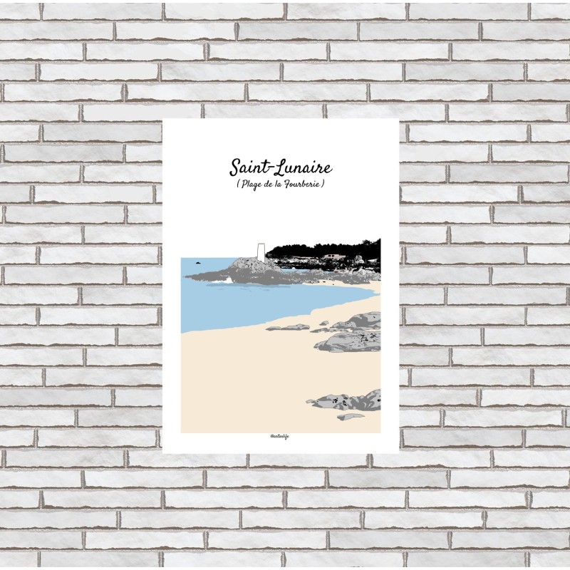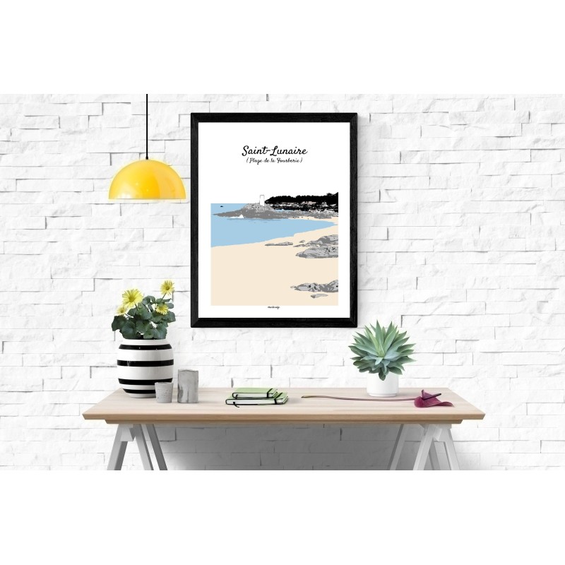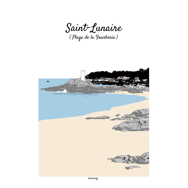 Cette affiche illustrée de la plage de la Fourberie à Saint-Lunaire, sur la Côte d’Émeraude en Bretagne, met en scène un paysage littoral à la fois minéral et délicat. La composition dévoile une plage de sable fin, bordée de rochers sculptés par les marées et baignée par une mer aux reflets bleutés.