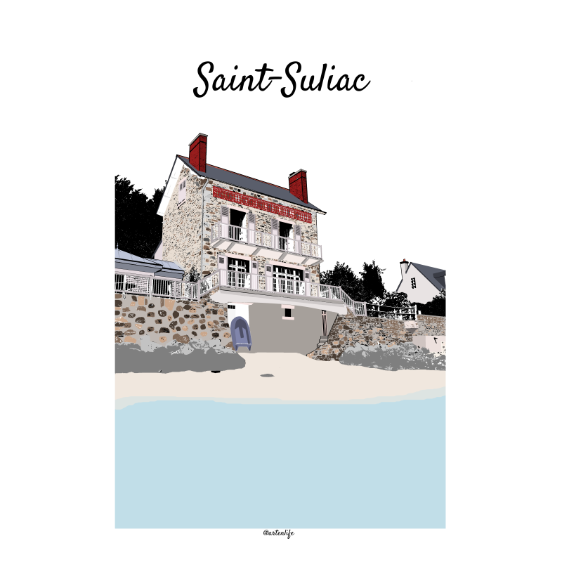 Cette affiche illustrée de la plage de Saint-Suliac, classé parmi les plus beaux villages de France, capture toute l’authenticité de ce joyau niché sur les bords de la Rance. La scène met en lumière une villa de bord de mer à l’architecture remarquable, avec son toit en ardoise, sa façade en granit taillé et ses détails en mosaïque de briques, emblématiques du patrimoine local.