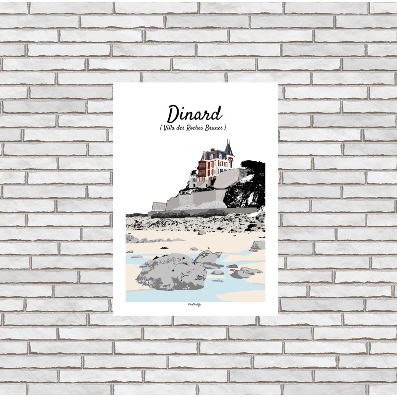 Réalisée dans un style graphique coloré, cette affiche décorative bretonne célèbre à la fois le patrimoine architectural et la beauté sauvage du littoral dinardais.
