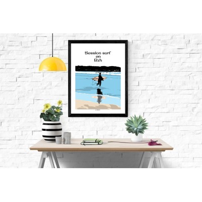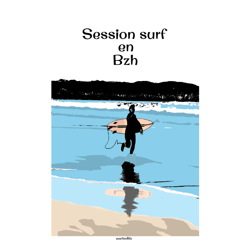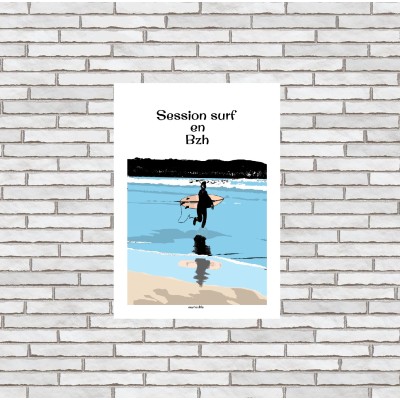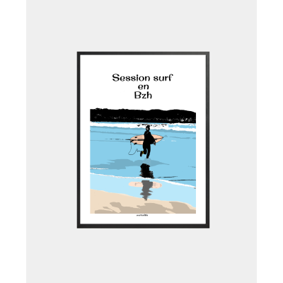 Affiche illustrée d' un surfer sur la plage des Blancs Sablons au Conquet sur la Rade de Brest dans le Finistère Nord en Bretagne.