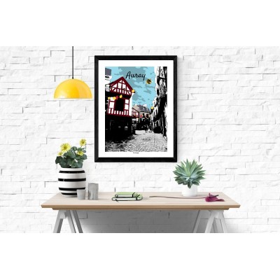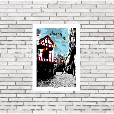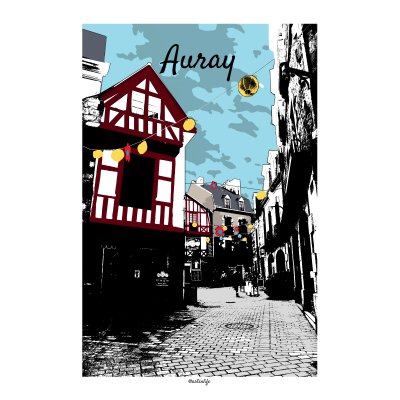 Affiche illustrée de la rue du Château à Auray près du quartier animé de Saint-Goustan dans le Morbihan.