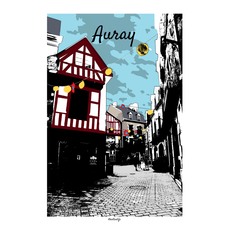 Cette illustration graphique et colorée vous transporte dans la Rue du Belzic, située dans la partie haute d’Auray. Ses maisons à colombages, ses boutiques et ses guirlandes estivales de fleurs et ballons jaunes créent une scène joyeuse et vivante, baignée de lumière.