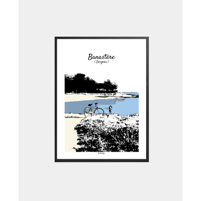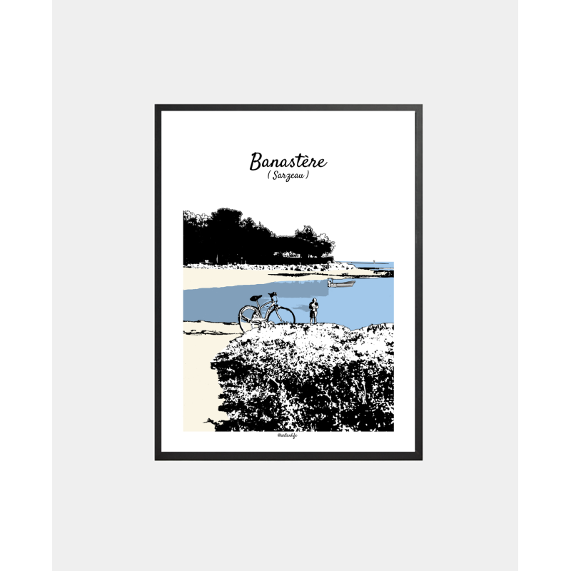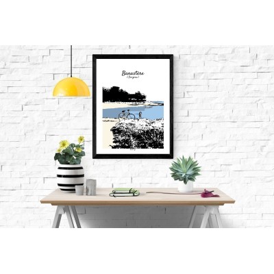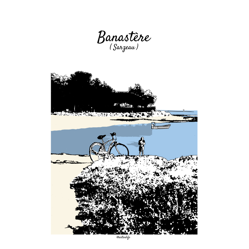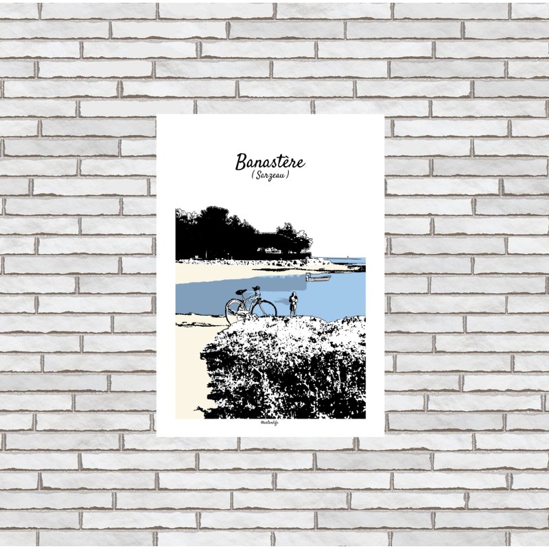 Cette affiche illustrée de la plage de Banastère, à Sarzeau sur la Presqu’île de Rhuys, dépeint une scène paisible de bord de mer.