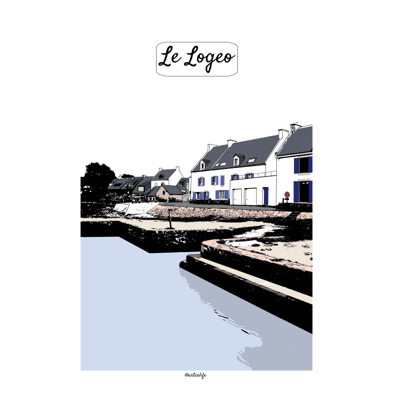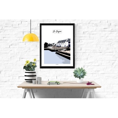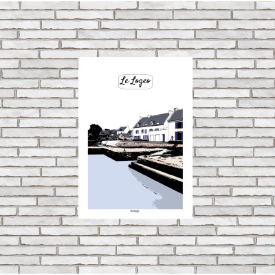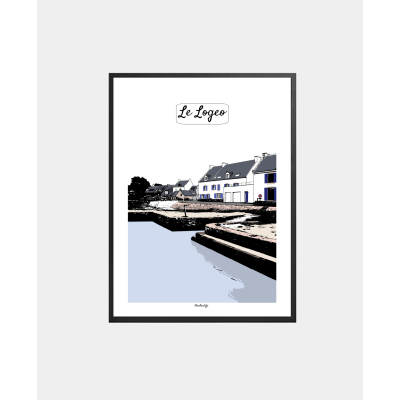 Cette affiche illustrée du Port du Logeo, à Sarzeau, sur la Presqu’île de Rhuys, invite à redécouvrir la douceur d’un port breton préservé. Au premier plan, une piscine ostréicole se dessine dans les tons bleu pâle, tandis qu’à l’arrière, les maisons traditionnelles bordent discrètement le rivage. L’ensemble baigne dans une lumière douce, typique des fins de soirées calmes sur la côte.