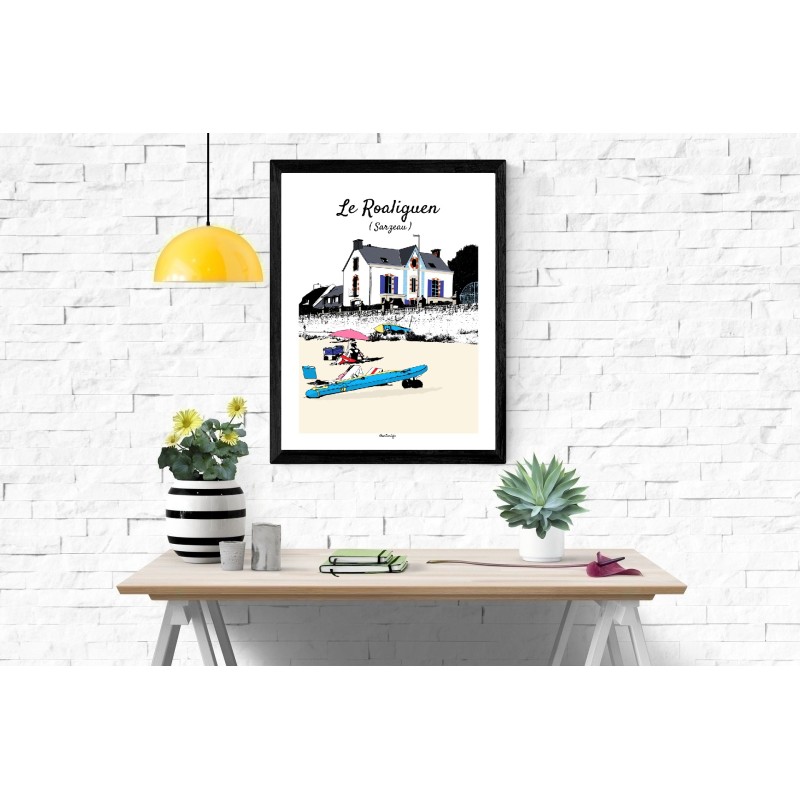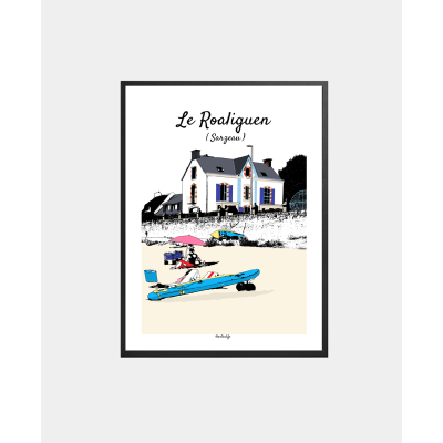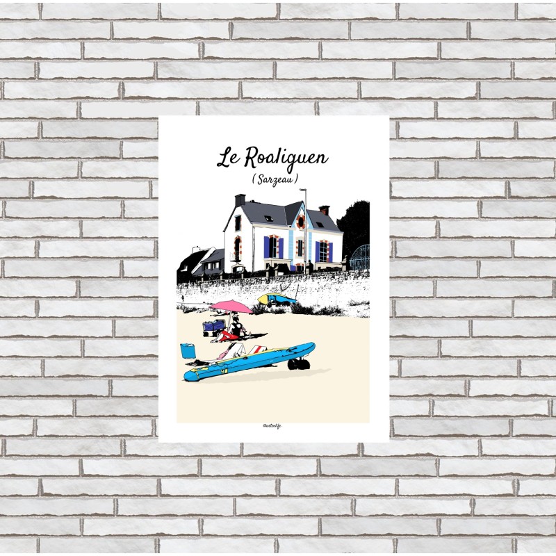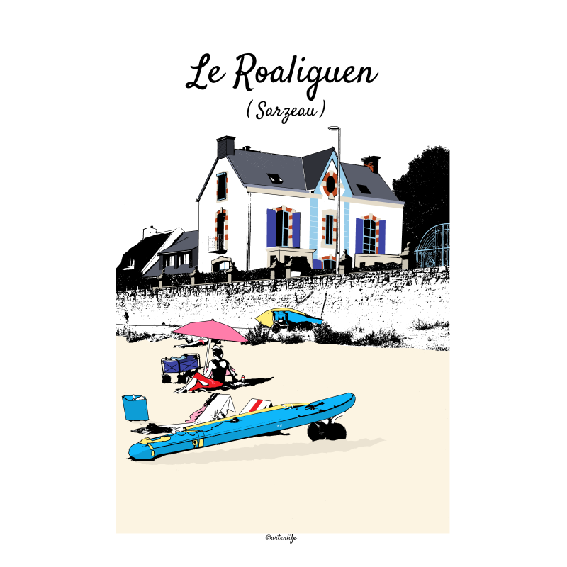 Cette affiche illustrée de la plage du Roaliguen, à Sarzeau, capture un moment chaleureux et joyeux d’une journée d’été ensoleillée.
