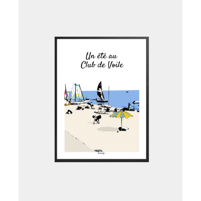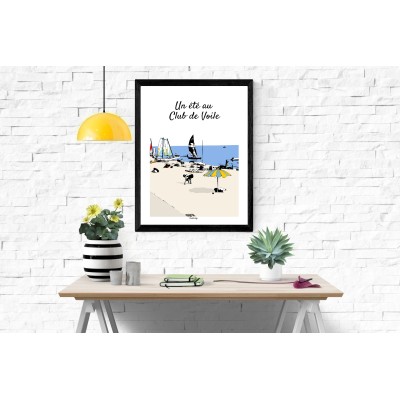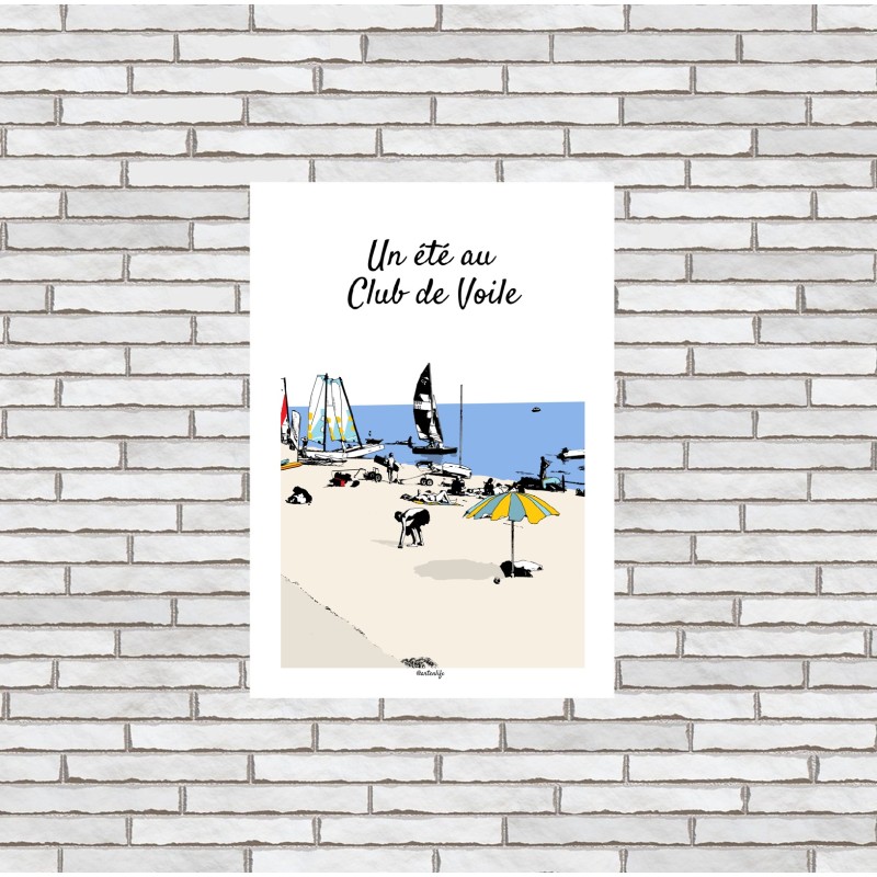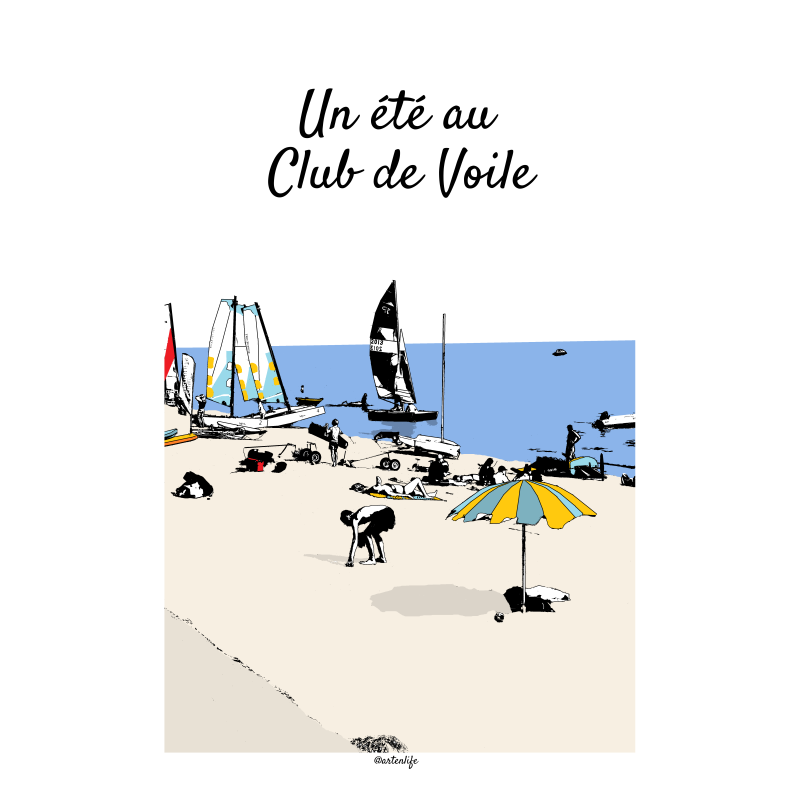 Cette affiche illustrée capture un instant joyeux et vivant sur une plage de sable fin, au cœur d’un club de voile en Presqu’île de Rhuys.
