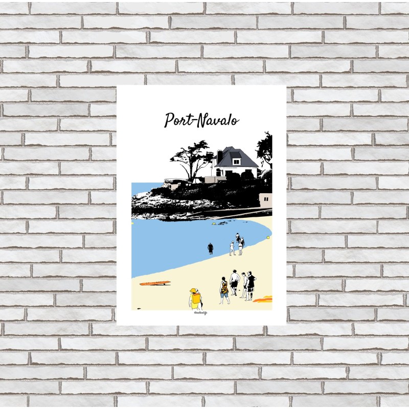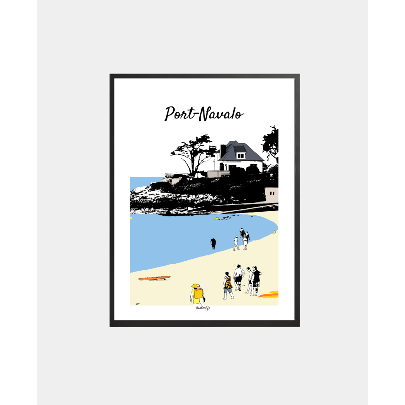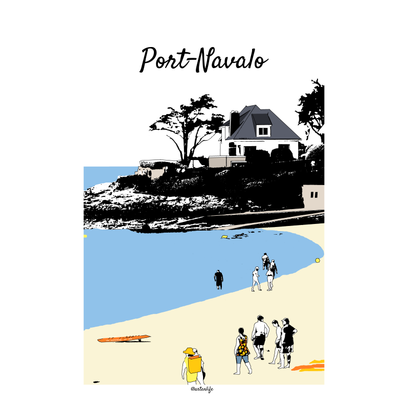 Cette affiche illustrée de la grande plage de Port-Navalo capture un moment vibrant d’été sous un ciel lumineux.