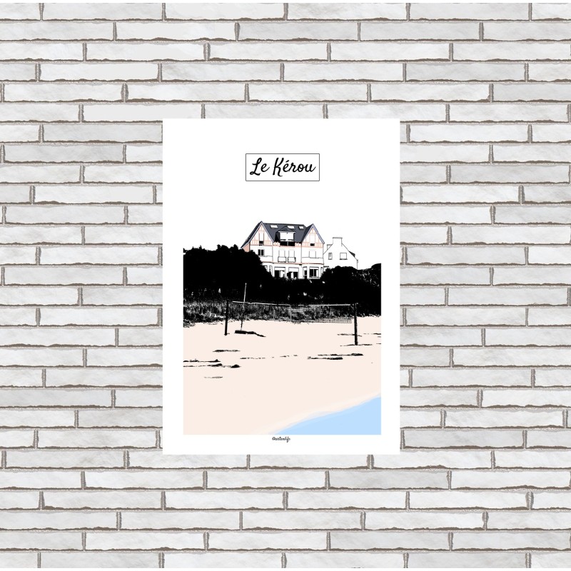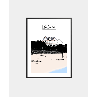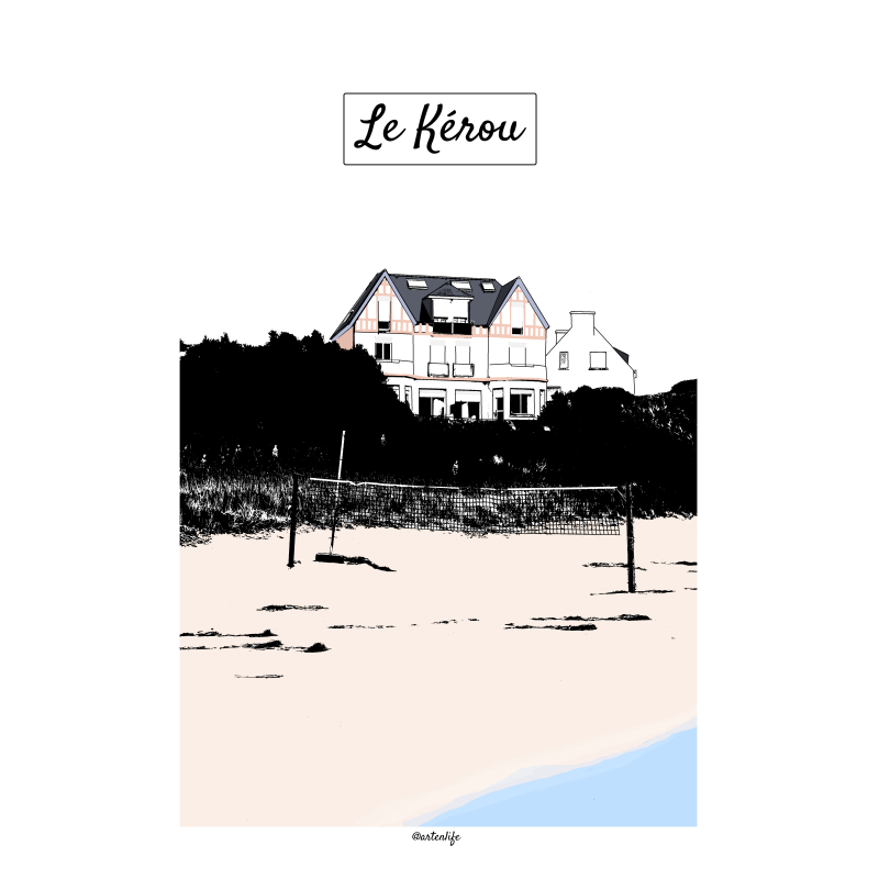 Cette affiche illustrée capture un moment apaisant au début de la journée sur la plage du Kerou, à Clohars Carnoët.