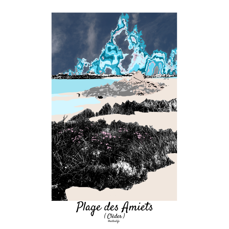 Découvrez la douceur ensoleillée du littoral breton avec l’affiche “Cléder – Plage des Amiets”, une illustration contemporaine et poétique qui capture la quiétude d’un après-midi printanier.