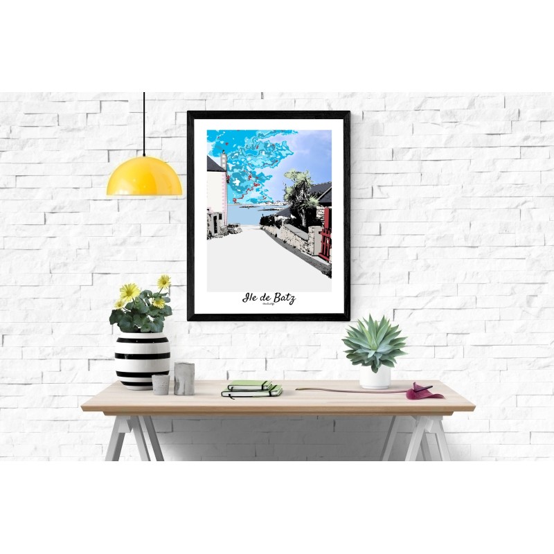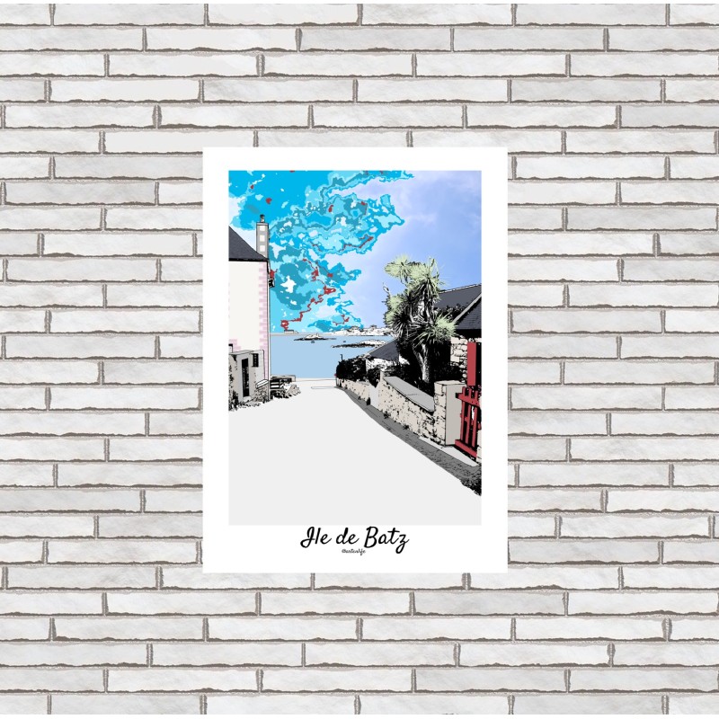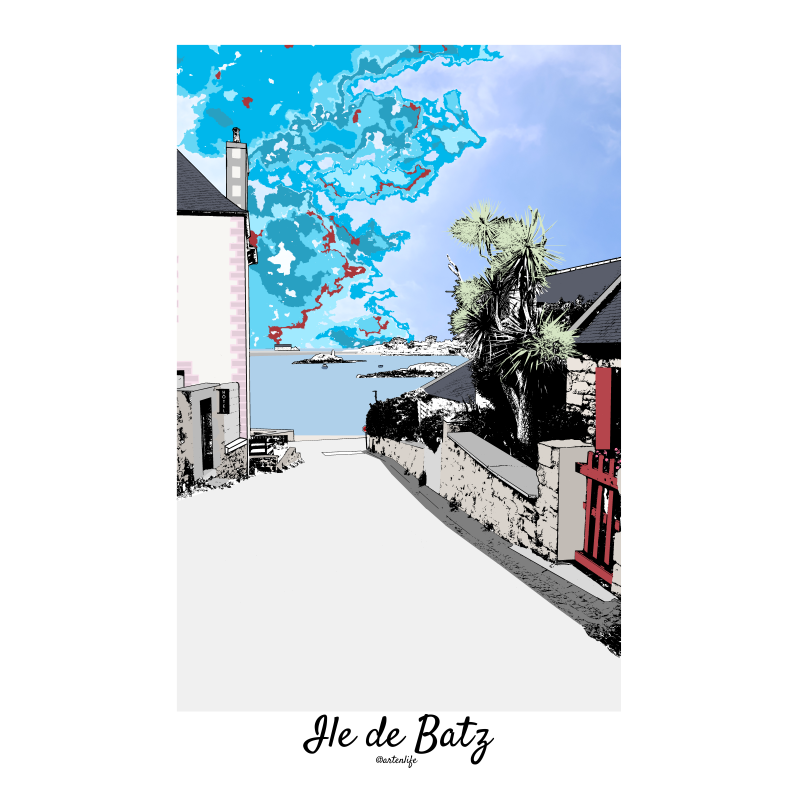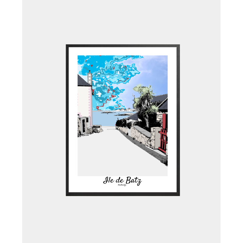 Laissez-vous charmer par l’âme authentique de l’Île de Batz avec l’affiche “Rue menant au Débarcadère”, une illustration douce et colorée qui évoque la tranquillité d’une balade vers la mer.