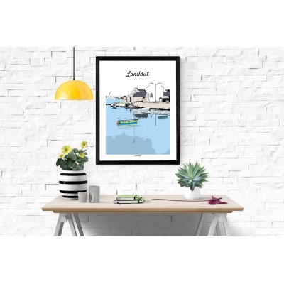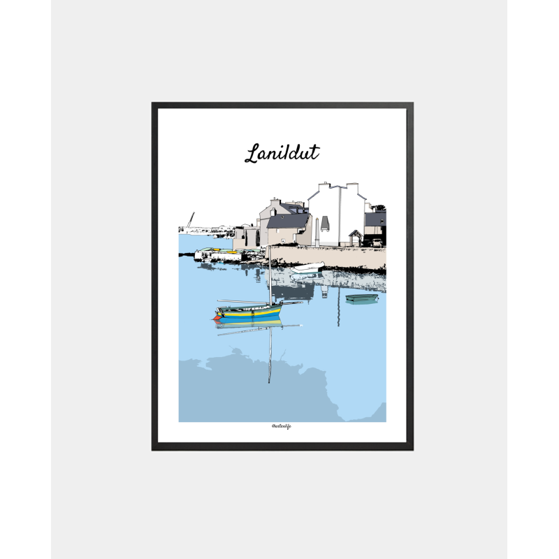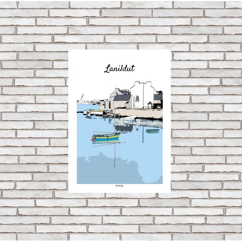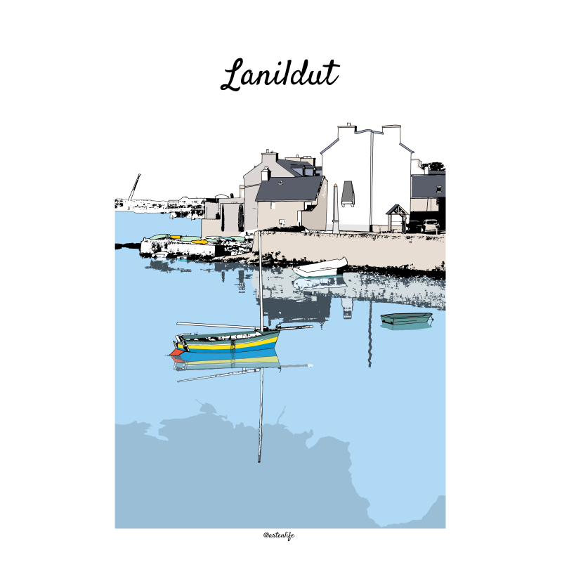 Plongez au cœur de Lanildut, petit bourg breton typique, avec cette illustration poétique et colorée qui capture l’atmosphère unique du port et du village au bord de l’eau.