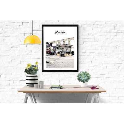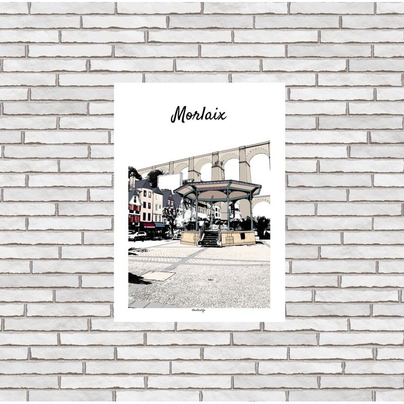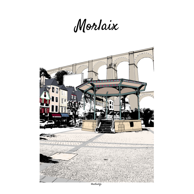 Sur le côté gauche, les maisons aux façades colorées, notamment rouges et vertes, ajoutent une touche vive et chaleureuse à la composition. Le parterre de la place, en teintes crème et gris clair, contraste avec le kiosque et les façades, donnant un équilibre visuel à la scène. L’ensemble, subtilement colorisé façon BD, offre une vision poétique et contemporaine de Morlaix.