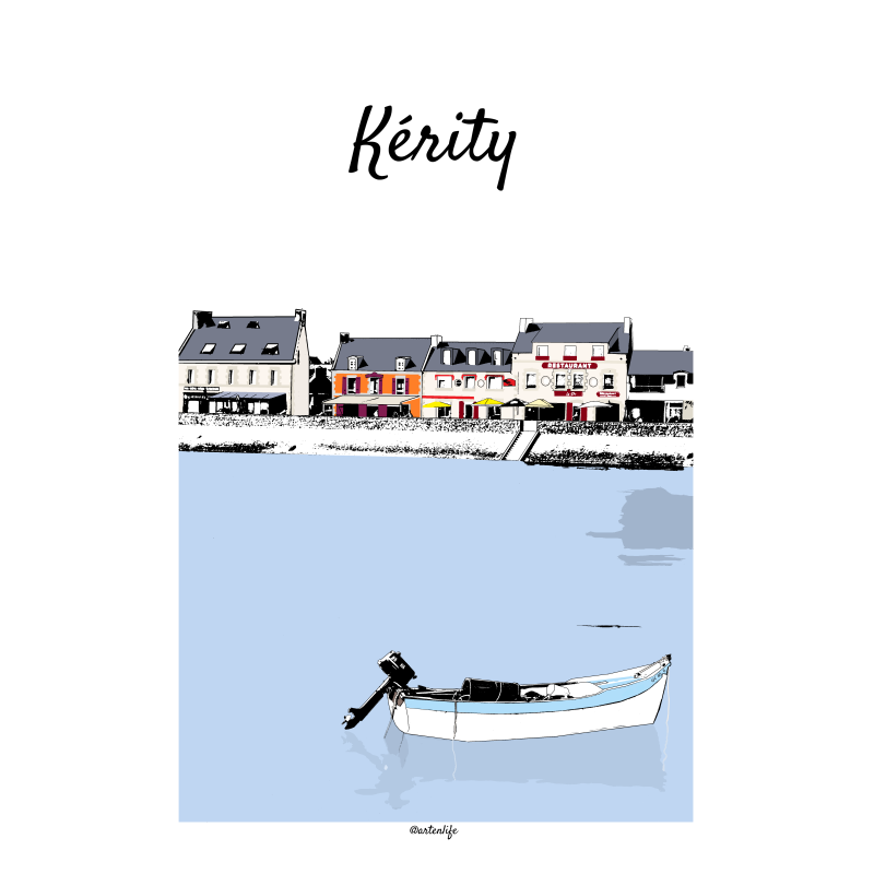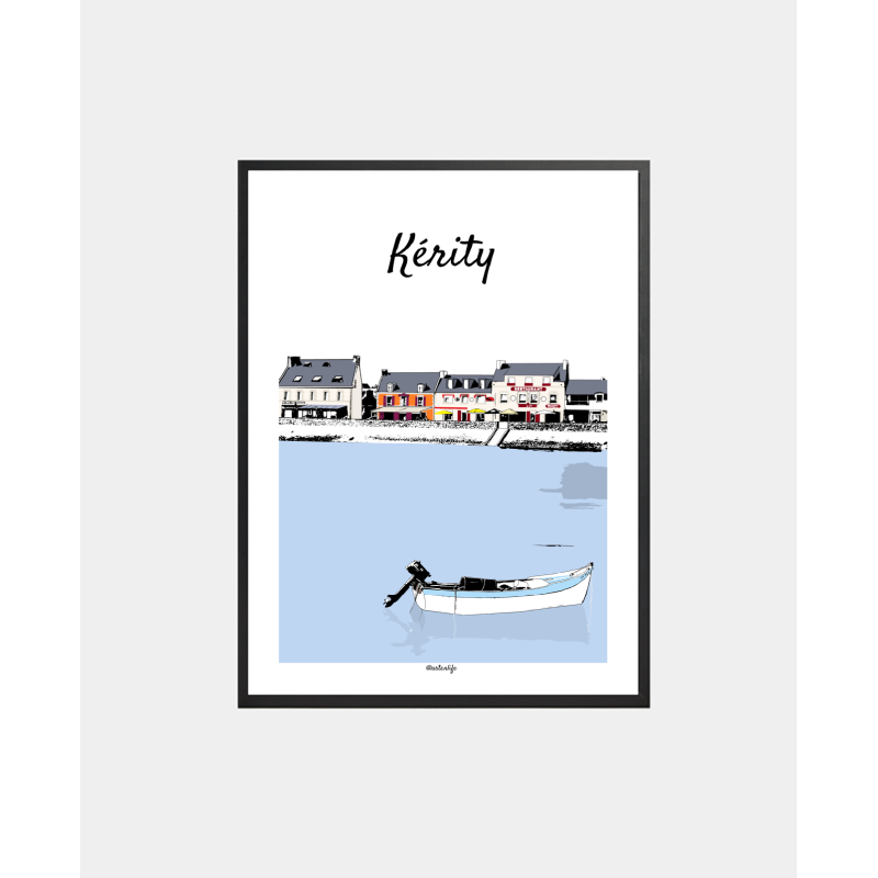 Cette affiche illustre le Port de Kérity à Penmarc'h, un port pittoresque du Finistère Sud. Au premier plan, la mer calme accueille un bateau blanc aux liserés bleu clair, tandis que derrière le muret de la digue se dressent les maisons colorées rouges et oranges, typiques de ce village maritime.
