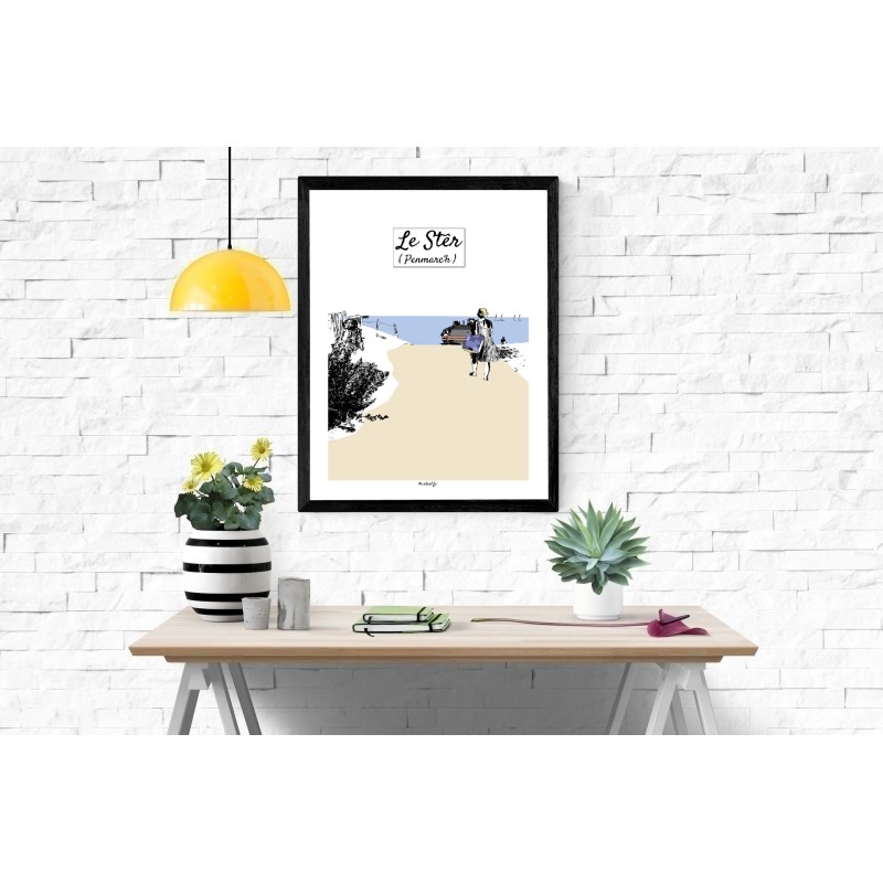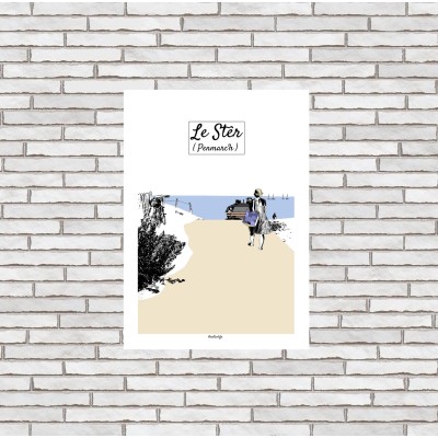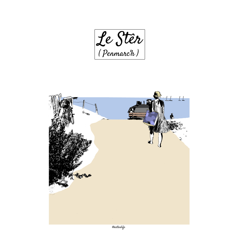 Cette affiche met en lumière la plage du Stêr à Penmarc’h, depuis la cale. Au premier plan, une femme avance tranquillement sur le chemin, chapeau de paille et sac violet à l’épaule, prête à profiter de la mer. Sur la dune, un vélo posé symbolise une approche écologique et sereine pour se rapprocher du rivage.