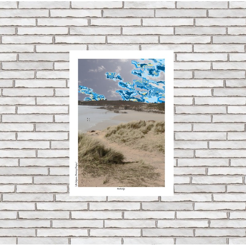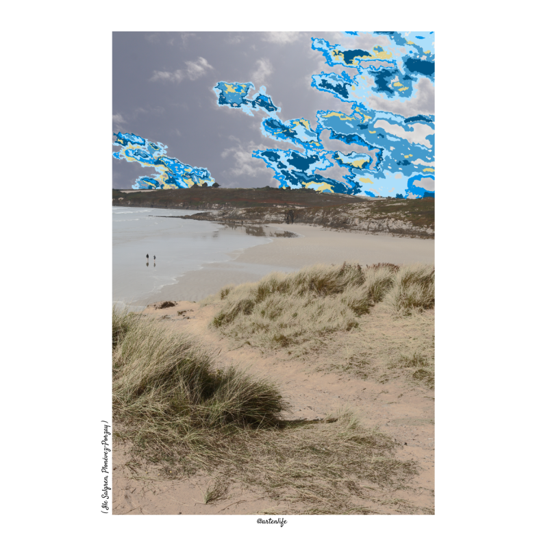 Depuis la plage de Ty an Guer, la vue s’étend sur la partie dunaire de l’Île Salgren, avant de se fondre dans une large étendue de sable doré et de mer bleutée. À l’horizon, la falaise se dessine dans une atmosphère douce et lumineuse. Deux promeneurs arpentent la plage, ajoutant une touche humaine à ce décor naturel apaisant. L’ensemble dégage un sentiment de calme et de liberté, typique des paysages côtiers du Finistère.