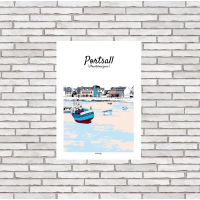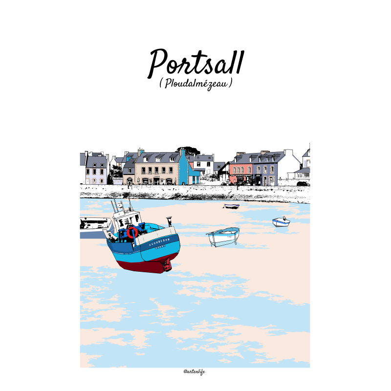 Sur le Port de Portsall à Ploudalmézeau, le sable doré alterne avec de petites mares résiduelles de marée, créant un jeu de reflets subtil. Au centre, des bateaux de pêche authentiques, dont le célèbre Scoubidou aux teintes bleu, rouge et blanc, reposent paisiblement, symboles d’une tradition maritime vivante. À l’arrière-plan, la côte dévoile ses bâtisses colorées, façades rouges, violettes et bleues, qui donnent à l’ensemble une atmosphère vive et chaleureuse.