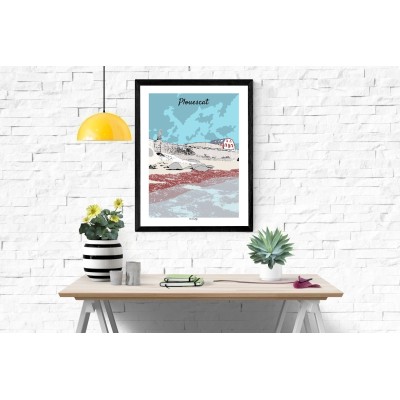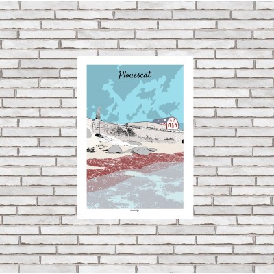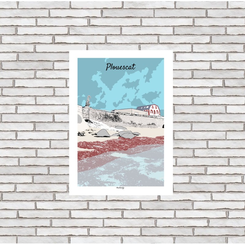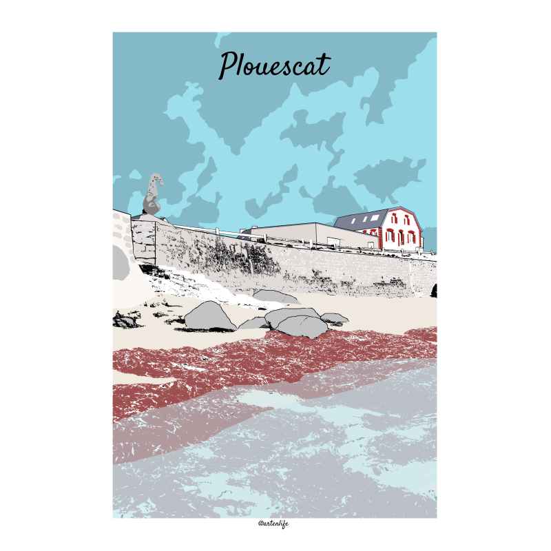 Cette affiche représente l’Hippocampe de Porsguen à Plouescat, symbole emblématique de ce coin du Finistère Nord. Au premier plan, la mer vert-eau borde une plage dorée parsemée d’algues rouges et de petits cailloux gris. En hauteur, l’hippocampe en granit gris se dresse majestueusement, accompagné d’une bâtisse bretonne aux briques traditionnelles. L’ensemble dégage une atmosphère tranquille et maritime, idéale pour une immersion dans la beauté authentique des côtes bretonnes.