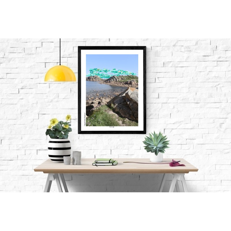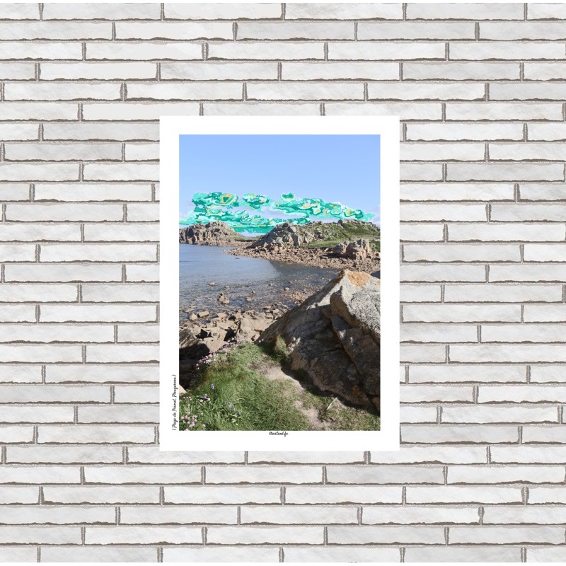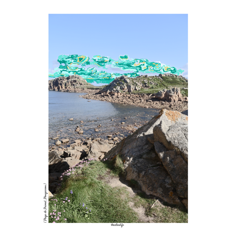 Découvrez la Pointe de Primel à Plougasnou, un véritable joyau du Finistère Nord. Cette affiche capture la mer turquoise entre les rochers verdoyants, les fleurs sauvages roses et violettes au premier plan, et un gros caillou dressé qui ajoute un point focal naturel. À l’arrière-plan, les rochers se fondent dans un horizon marin, tandis que le ciel pixellisé décline un dégradé de vert végétal et de beige doré, créant une atmosphère poétique et lumineuse.