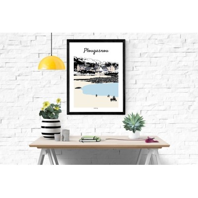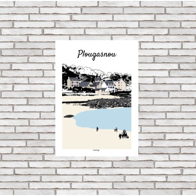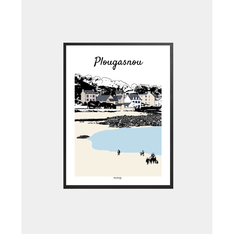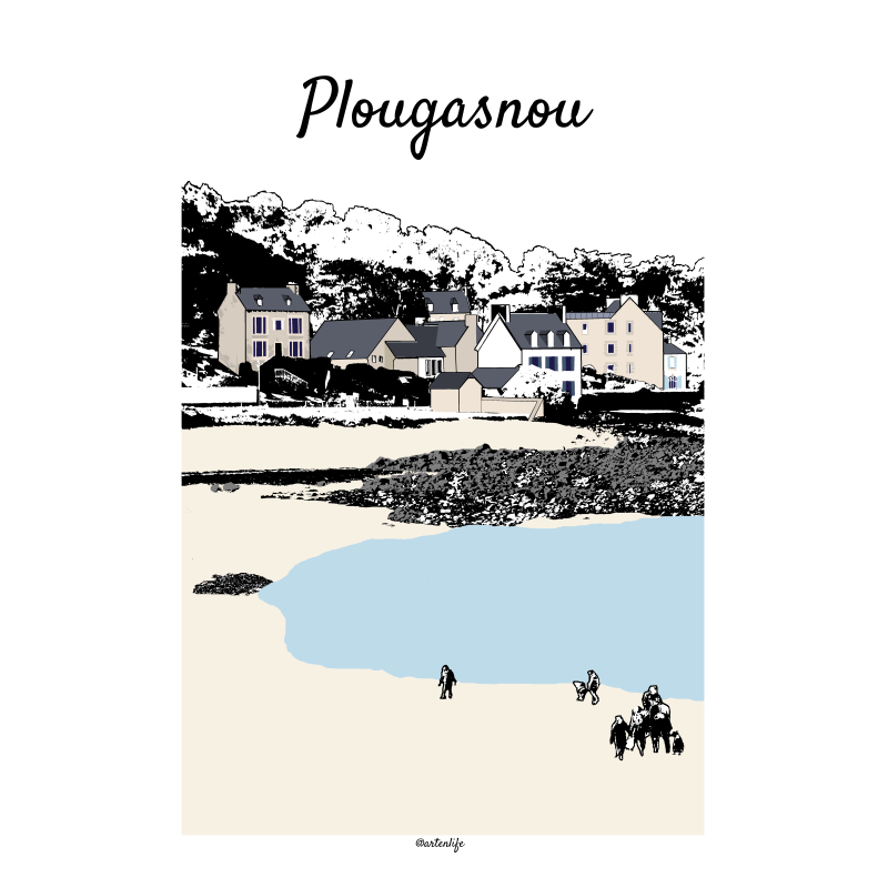 Cette affiche capture un moment de vie sur la Plage de Tregastel à Plougasnou, dans le Finistère Nord. Un groupe d’enfants explore la plage, à la recherche de coquillages et trésors marins, tandis que quelques rochers s’avancent sur le sable doré. À l’horizon, des maisons bretonnes colorées, avec façades beiges et volets bleus, se détachent de la végétation sombre, créant un contraste subtil et poétique. L’ensemble de la scène respire la joie de vivre et la douceur des paysages bretons, sublimée par un ciel blanc lumineux et un style graphique coloré façon BD.