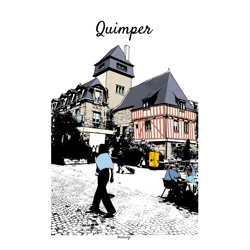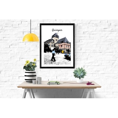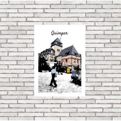 Cette affiche de Quimper illustre la Place Terre Au Duc, véritable joyau du centre historique. Sous un ciel clair, les bâtisses Renaissance et la maison à colombages se parent de teintes naturelles et poudrées, dominées par des marrons doux et des touches beiges.