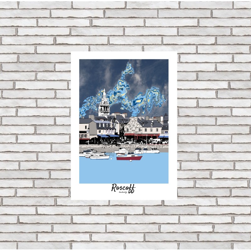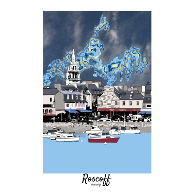 Sur cette illustration lumineuse du port de Roscoff, la Bretagne dévoile son charme intemporel. Les bateaux blancs et colorés flottent paisiblement dans les eaux du port, tandis que les quais animés reflètent la vie joyeuse d’un jour de printemps. En arrière-plan, les bâtisses bretonnes colorées apportent chaleur et authenticité à la scène, dominées par la tour clocher en noir et blanc de l’église du village qui se détache fièrement dans le ciel pixelisé bleu et beige.