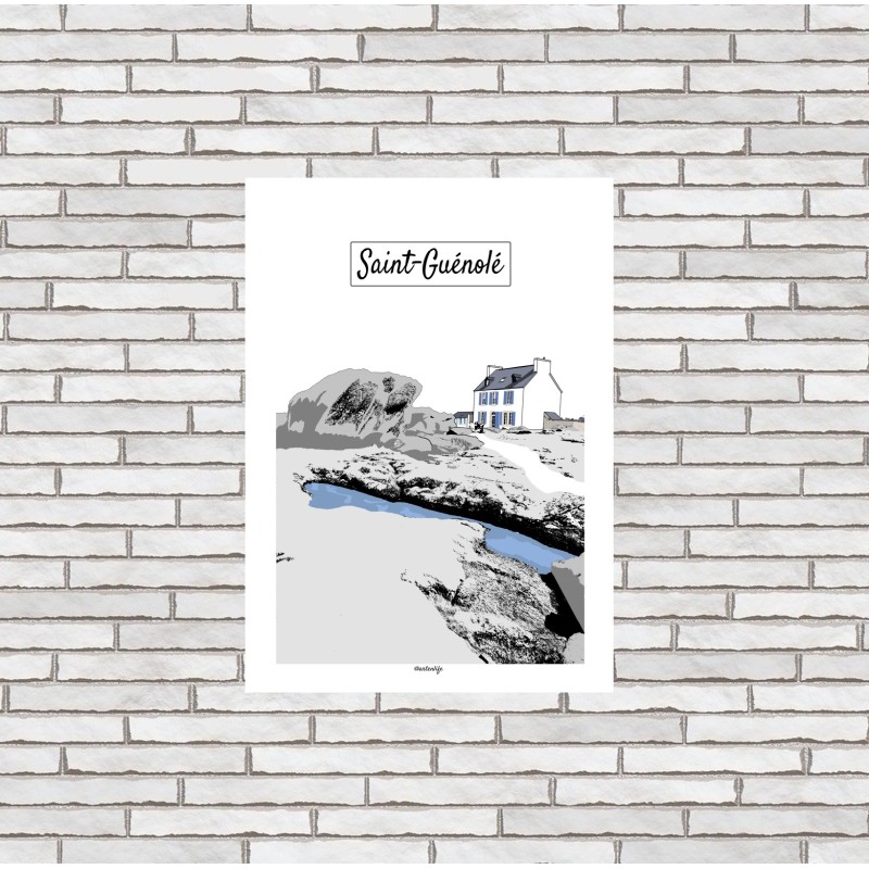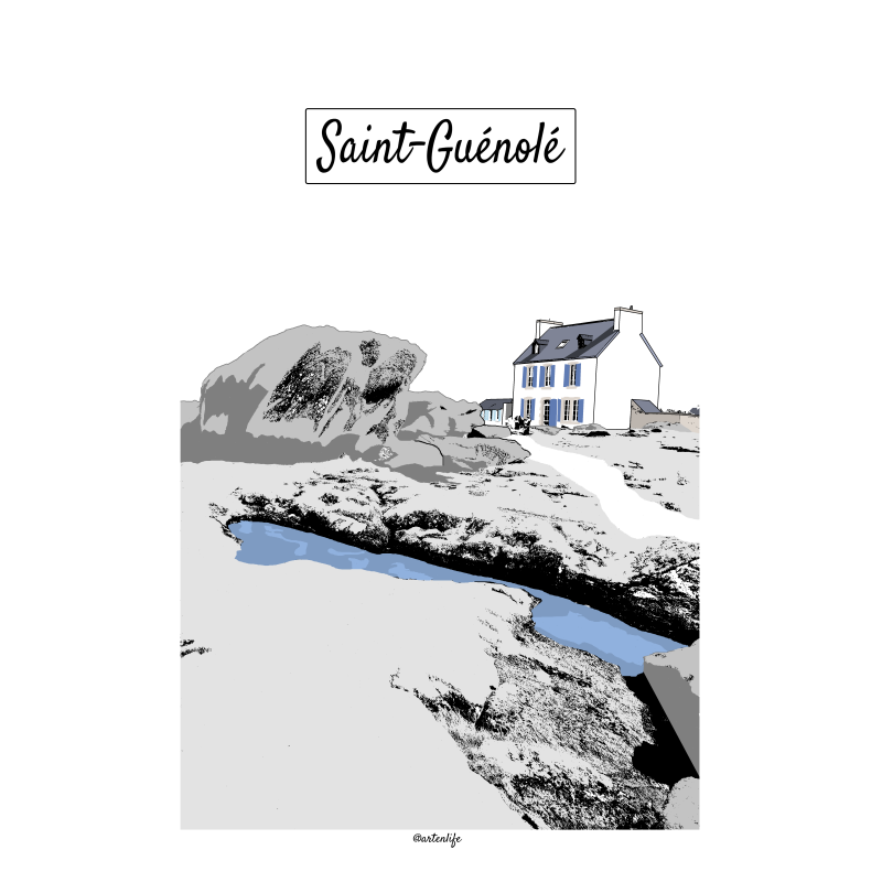 Illustration colorée des rochers de Saint-Guénolé à Penmarc’h, montrant une mare résiduelle au milieu des rochers gris. Sur le bord du chemin, une maison traditionnelle bretonne se dresse avec son toit en ardoise et ses volets bleus, créant un contraste charmant avec la nature environnante. Le ciel blanc apporte clarté et met en valeur la pureté des couleurs de la côte bretonne.