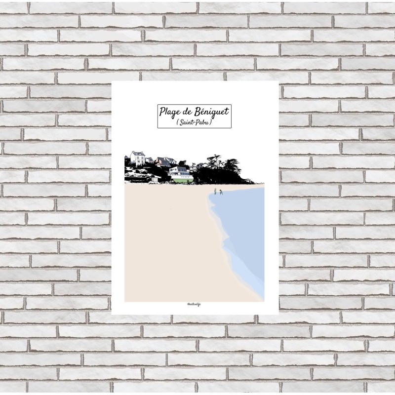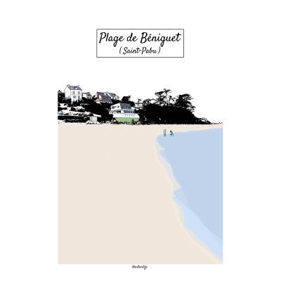 Affiche illustrée de la plage de Béniguet à Saint-Pabu, un lieu emblématique du littoral breton où la mer turquoise vient caresser le sable blond. Deux enfants jouent dans l’eau, incarnant la simplicité et la joie estivale. À l’horizon, les maisons du bord de mer se détachent de la végétation sombre, leurs façades colorées de rose et de vert apportant une note vive et joyeuse à la composition.