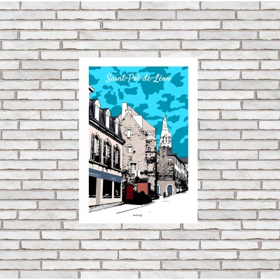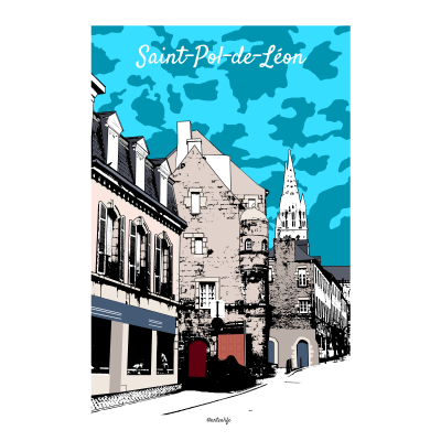 Affiche illustrée de Saint-Pol-de-Léon, représentant la Rue du Général Leclerc, l’une des plus emblématiques du bourg historique. Les bâtisses de pierre d’époque Renaissance, aux portes et volets colorés, guident le regard vers la majestueuse église et son clocher élancé. Sous un ciel bleu vif, la lumière met en valeur les textures de granit et les détails architecturaux des maisons bretonnes, créant une atmosphère à la fois vivante et authentique.