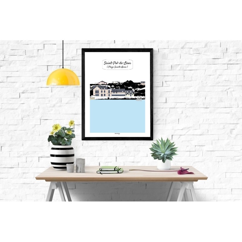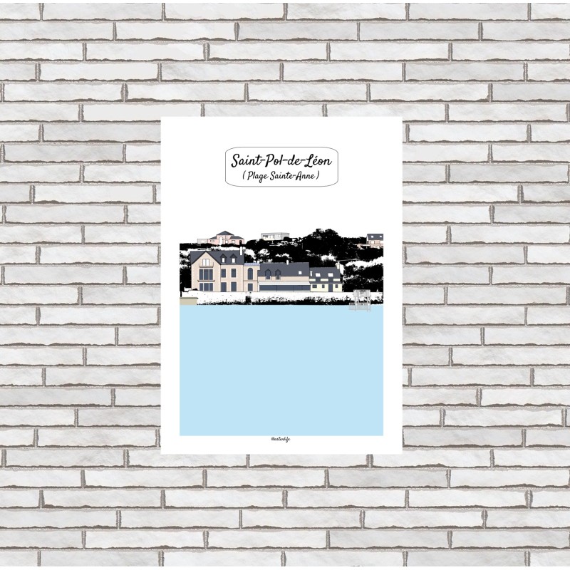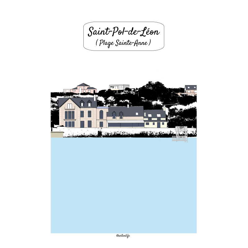 Affiche illustrée de Saint-Pol-de-Léon, mettant à l’honneur la plage Sainte-Anne, lieu emblématique du littoral léonard. Au premier plan, la mer bleue et apaisée s’étend jusqu’au plongeoir de mer, symbole d’été et de baignades familiales. À l’horizon, l’hôtel-restaurant Sainte-Anne et quelques maisons perchées sur la végétation sombre se détachent délicatement du paysage, créant un contraste harmonieux entre nature, architecture et bord de mer.