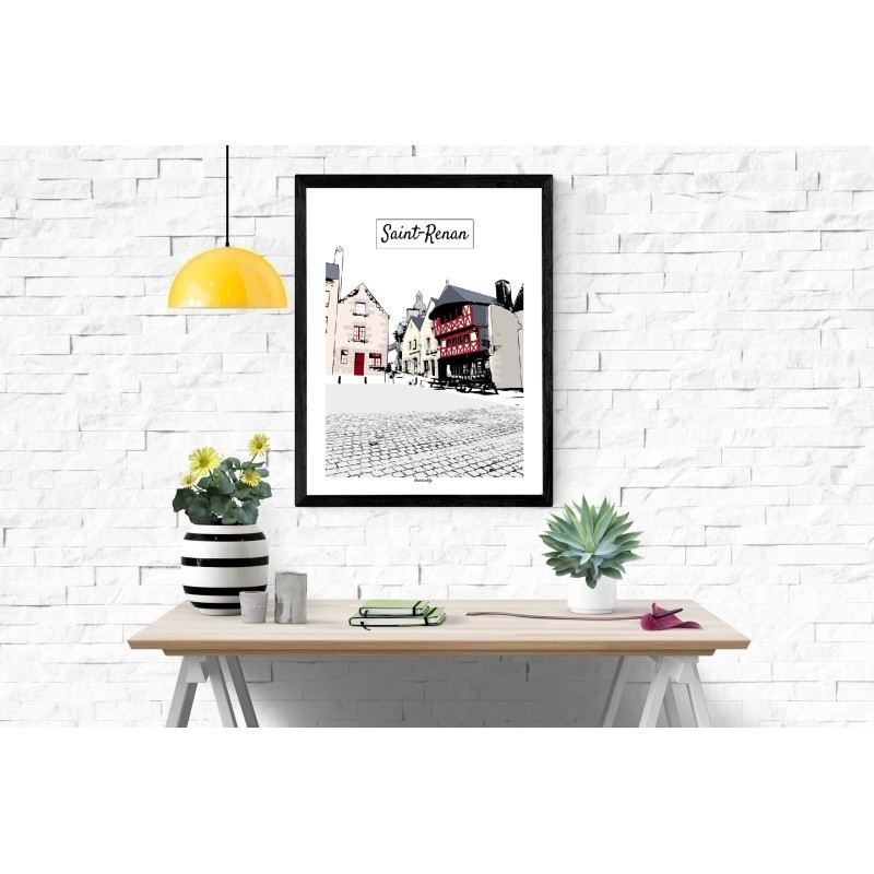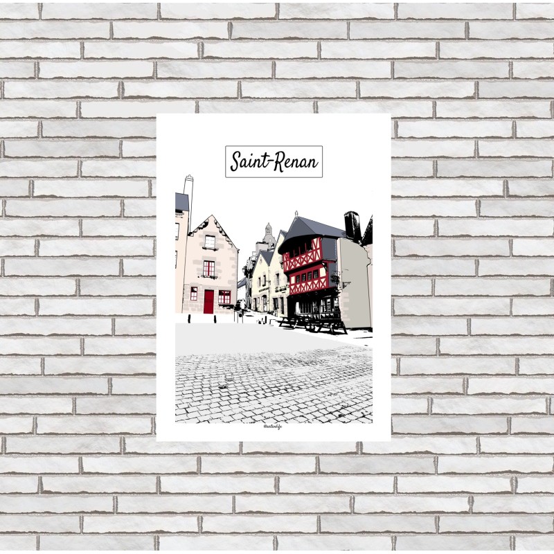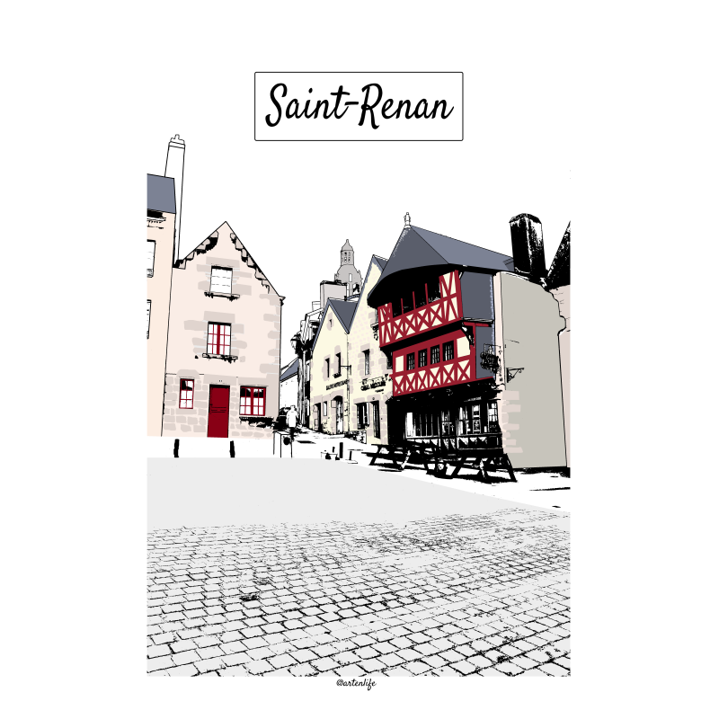 Cette affiche de Saint-Renan capture la beauté authentique de la Place du Vieux Marché, cœur historique de la ville. Les maisons en granit se dressent fièrement, témoins du passé, tandis que la maison à colombage rouge attire le regard, symbole d’un patrimoine vivant et coloré. Sous un ciel blanc et lumineux, l’ambiance évoque la douceur d’une matinée bretonne, où le temps semble suspendu au charme des vieilles pierres.