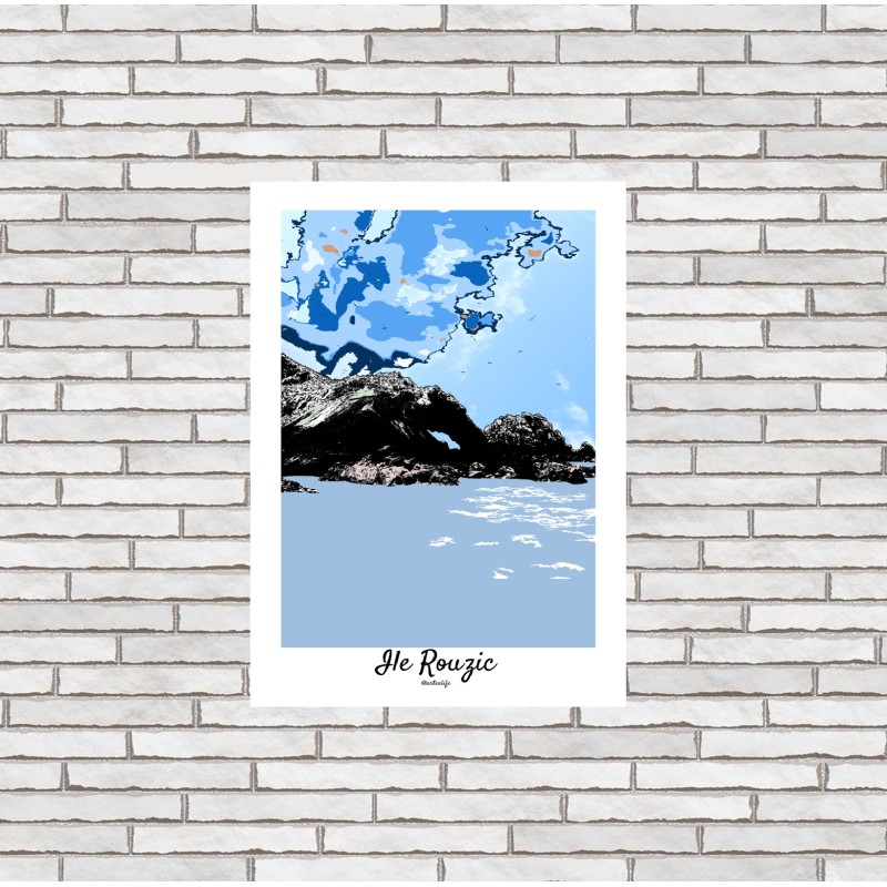 Cette affiche de l’Archipel des 7 îles met à l’honneur l’Île Rouzic, site emblématique et sauvage des Côtes d’Armor, célèbre pour abriter des milliers de fous de Bassan. L’illustration graphique, au style bande dessinée colorée, représente un bout de l’île aux rochers noirs et blancs, sculptés par les éléments. Dans le ciel, une nuée de goélands et de fous de Bassan vole librement, apportant mouvement et vie à la composition.
