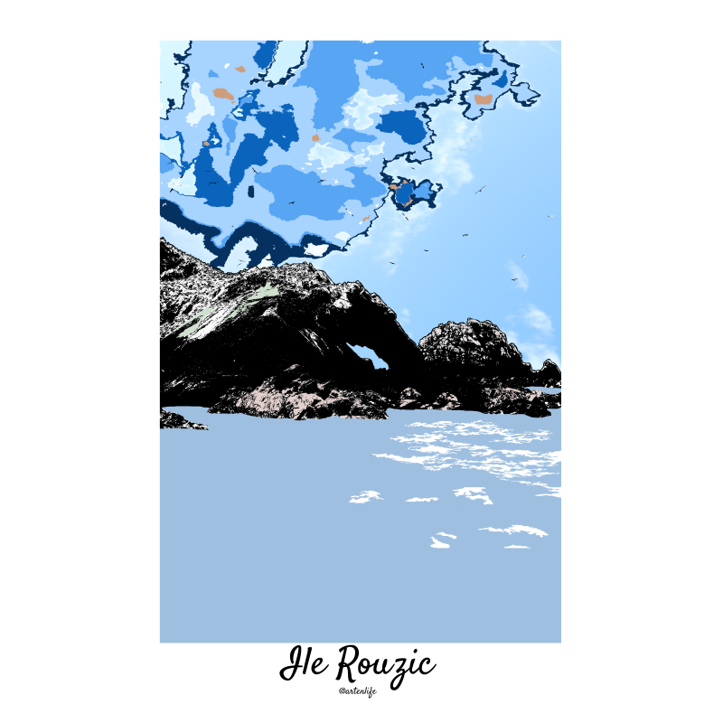 Au premier plan, la mer bleue, animée de légères vaguelettes, renforce la sensation d’immensité et de fraîcheur. Le ciel pixelisé, décliné dans un dégradé de bleus rehaussé d’une pointe de beige, enveloppe la scène d’une lumière douce et légèrement minérale. Une touche de vert algue sur l’un des rochers vient subtilement rappeler la richesse naturelle et maritime de cette île mythique.