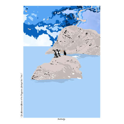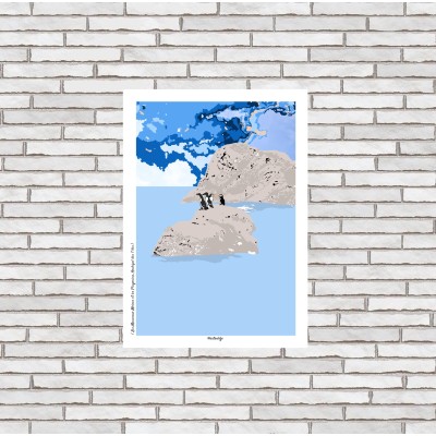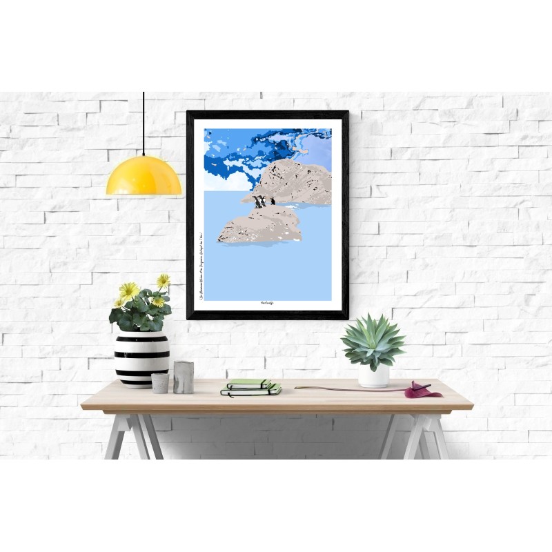 Cette affiche animalière bretonne met en scène un îlot rocheux émergeant de la mer bleue, refuge paisible pour quatre oiseaux emblématiques : deux macareux-moines et deux pingouins, perchés côte à côte. Le rocher gris, aux formes douces et minérales, contraste avec l’intensité de l’océan et sert de promontoire naturel à ces silhouettes reconnaissables entre toutes.