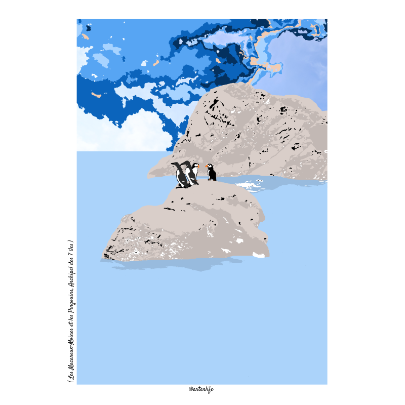 Le ciel pixelisé, décliné dans un dégradé de bleus subtilement réchauffé par une touche d’orangé, enveloppe la scène d’une lumière graphique et contemporaine. L’ensemble dégage une atmosphère à la fois ludique, contemplative et apaisante, évoquant la richesse de la faune marine et la poésie des côtes bretonnes.