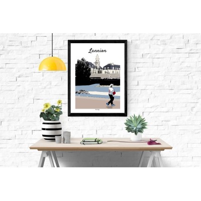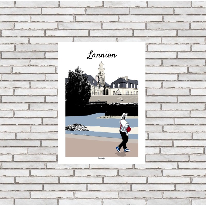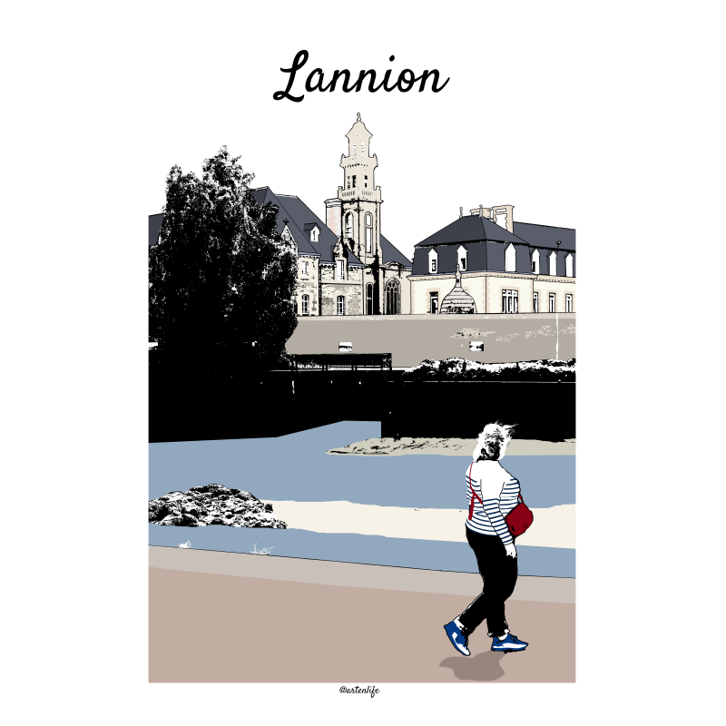 Cette affiche illustre une balade sur les quais du Léguer à Lannion, dans les Côtes d’Armor. Une femme en marinière se promène le long du quai, contemplant la rivière bleu qui s’étend paisiblement devant elle. En arrière-plan, se dresse l’Espace Sainte-Anne, partiellement caché par un arbre sur la gauche, avec ses murs et façade beige apportant douceur et contraste à la scène.