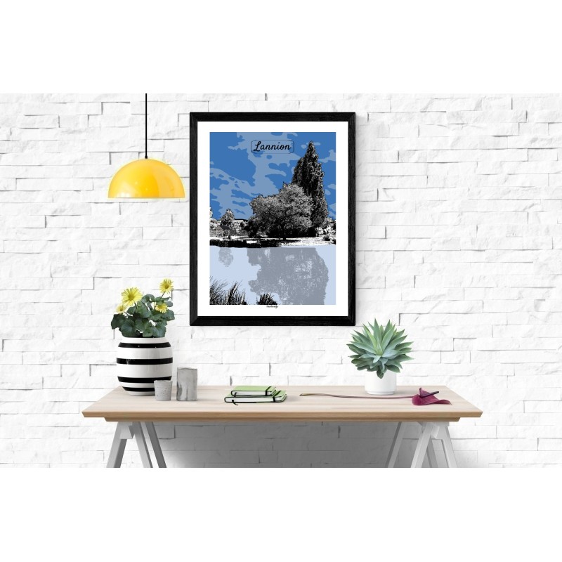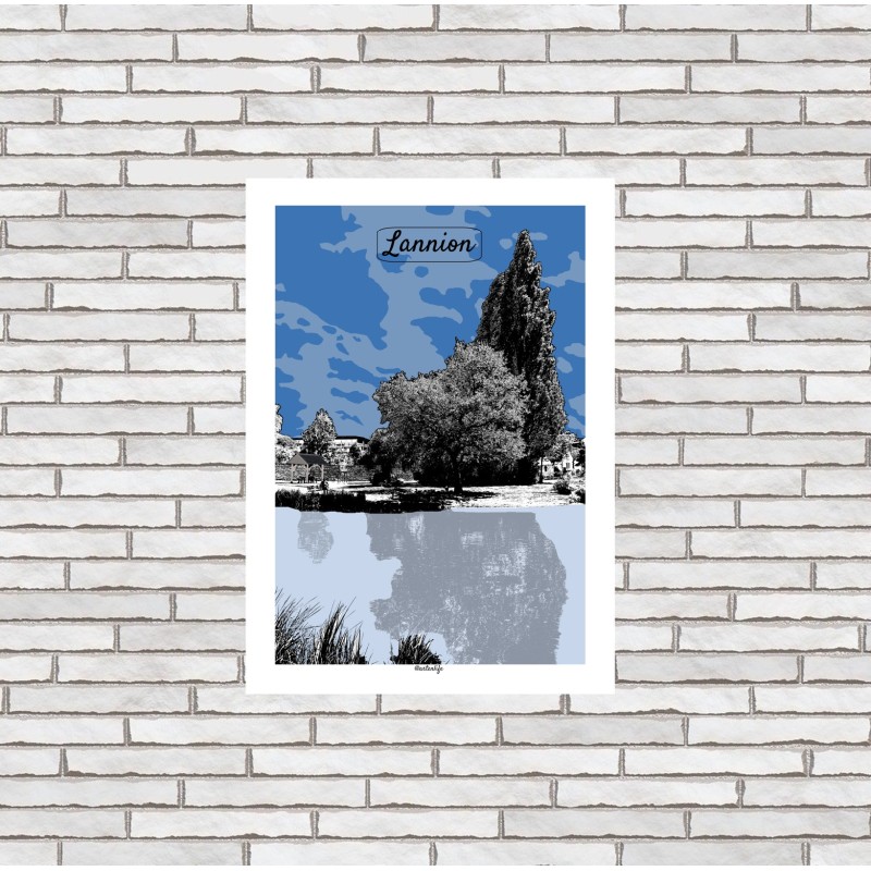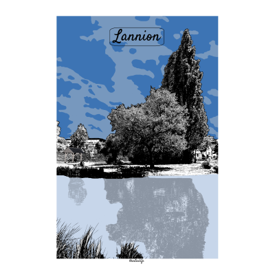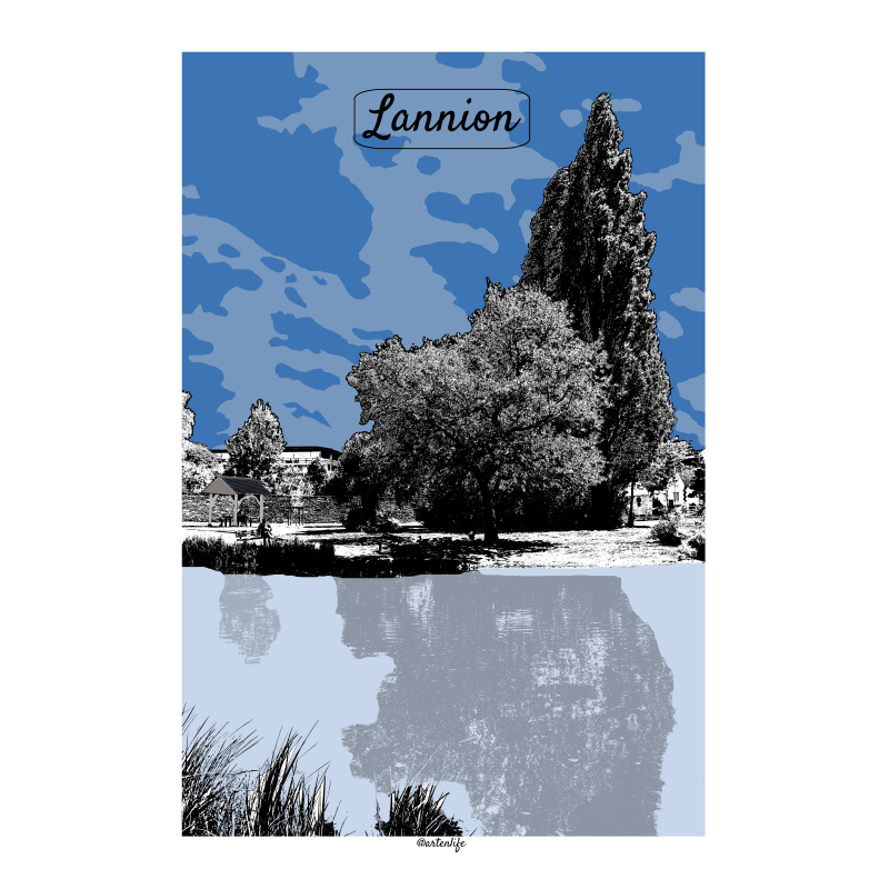 Cette affiche capture le Parc Sainte-Anne à Lannion, avec son étang paisible reflétant les arbres et le ciel bleu. Un saule pleureur se dresse majestueusement au bord de l’eau, ajoutant une touche poétique et romantique à la scène. Les tables de repos en noir et bleu ardoise ponctuent le parc, tandis que la végétation noire contraste avec les tons lumineux de l’étang bleu et du ciel.