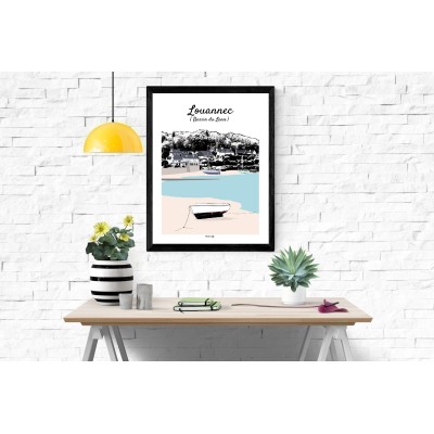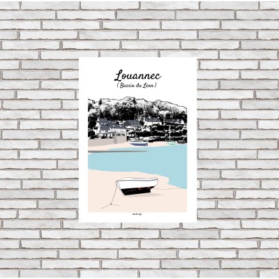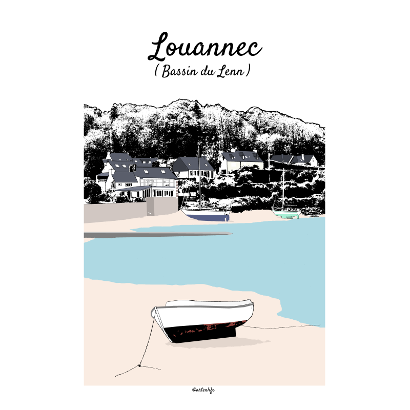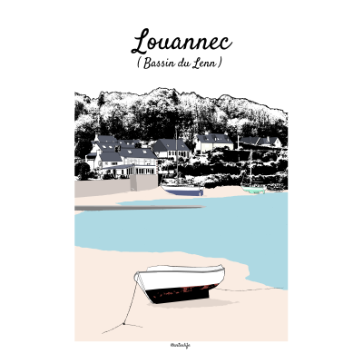 Cette affiche illustrée du Bassin du Lenn à Louannec capture une scène paisible du littoral des Côtes d’Armor, où des bateaux de plaisance colorés reposent sur la plage, au rythme tranquille de la marée.