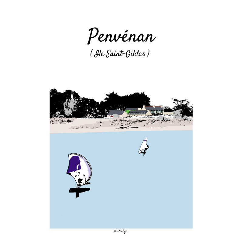 Au premier plan, la mer bleue s’anime : deux wingsurfeurs glissent sur les vagues, portés par le vent, insufflant à la scène une dynamique contemporaine et sportive.