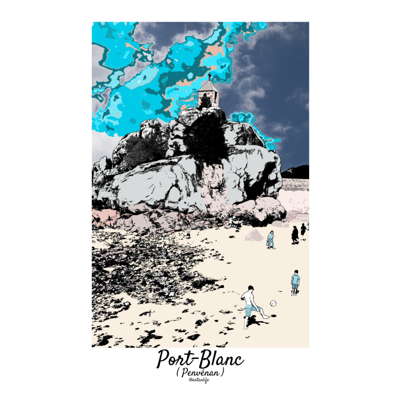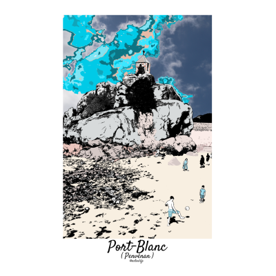 Le ciel pixelisé, décliné dans un dégradé de bleu, vert d’eau et touches orangées, fait écho aux teintes chaudes du granit rose, renforçant l’harmonie entre nature, patrimoine et moments partagés.