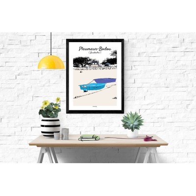 Affiche de la Plage de Landrellec à Ploemeur-Bodou. Illustration graphique colorée style bande dessinée. Vue sur la plage et le port pittoresque. Au premier plan, deux barques colorées bleu reposent sur le sable. Derrière le muret en pierre, une maison traditionnelle en granit avec son toit en ardoise se détache au milieu de la végétation noire, apportant un contraste élégant et authentique. L’ambiance ressentie est paisible et lumineuse, idéale pour évoquer la Bretagne maritime.