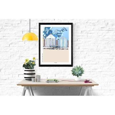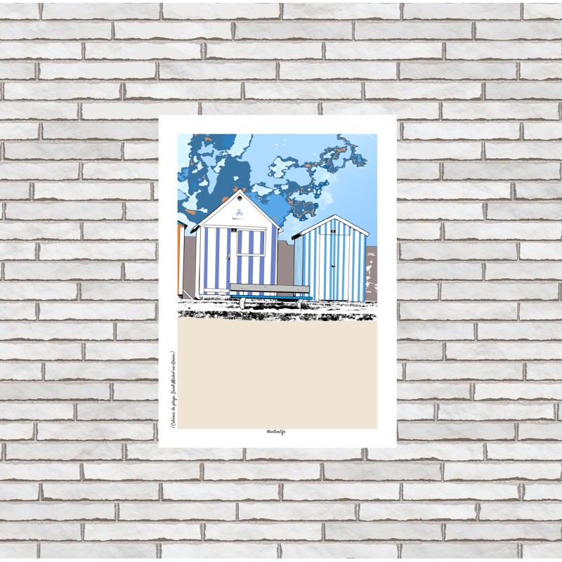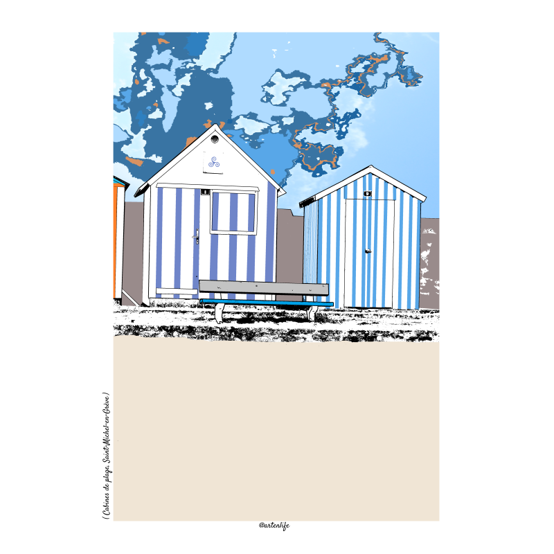 Cette affiche des cabines de Plage de Saint-Michel-en-Grève met en scène une plage bretonne emblématique à travers une illustration graphique colorée au style bande dessinée. Sur le sable, plusieurs cabines de plage se dressent face à la mer, reconnaissables à leurs rayures verticales blanches et bleu ciel, évoquant immédiatement l’univers balnéaire et les vacances d’été.