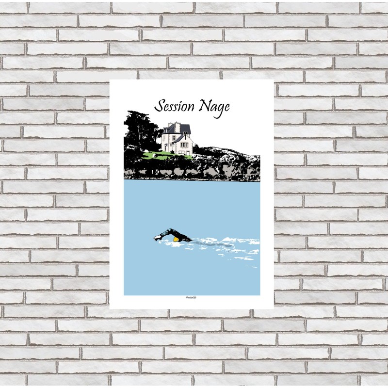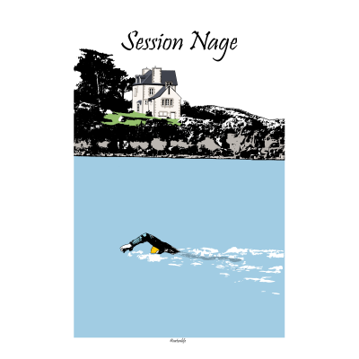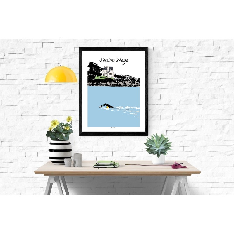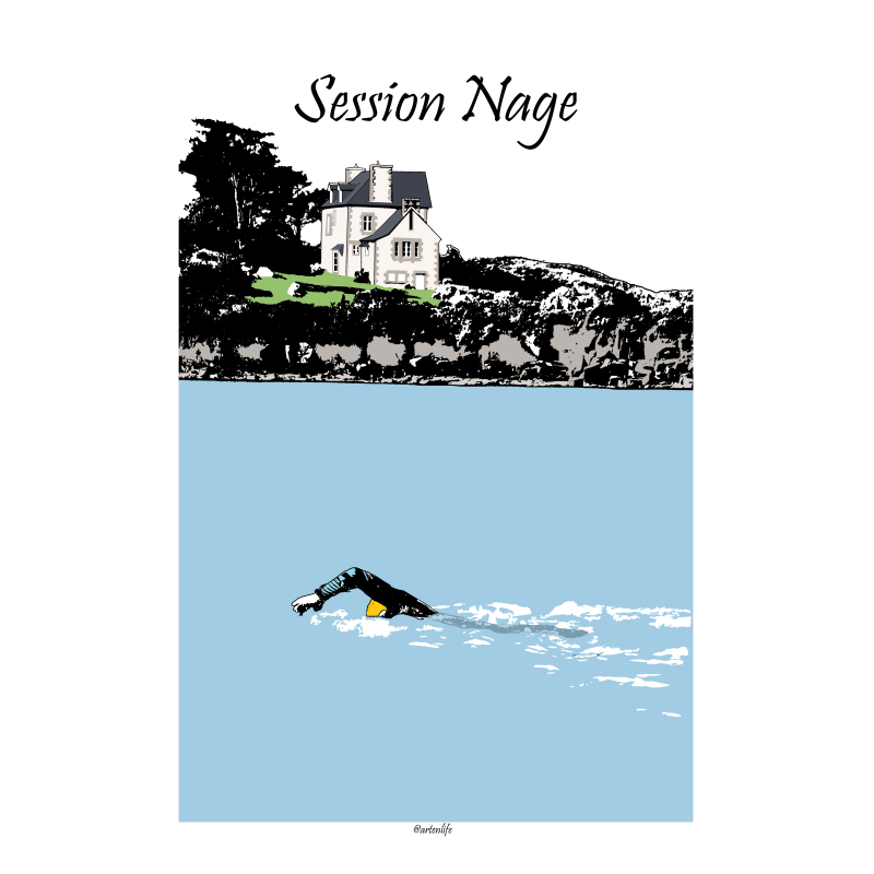 L’affiche Session Nage capture un moment de sport en pleine mer, entre concentration et liberté. Au premier plan, un nageur en crawl, équipé d’une combinaison et d’un bonnet jaune, fend l’eau bleutée lors d’une session d’entraînement en eau libre.