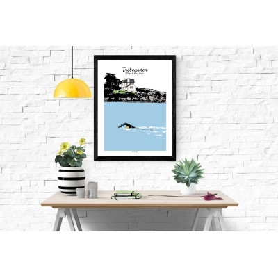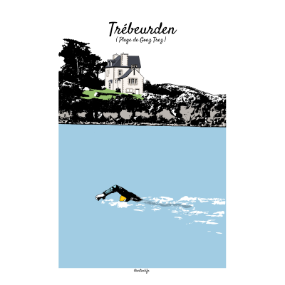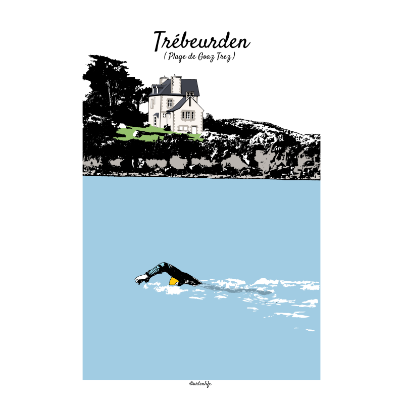 Cette affiche de la Plage de Goaz Trez à Trébeurden met en scène un nageur en crawl, s’entraînant en combinaison de nage et bonnet jaune, glissant dans la mer bleue animée de vaguelettes blanches.