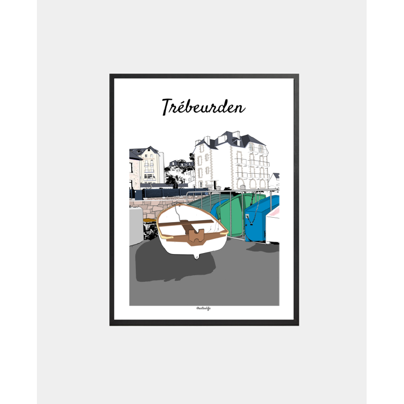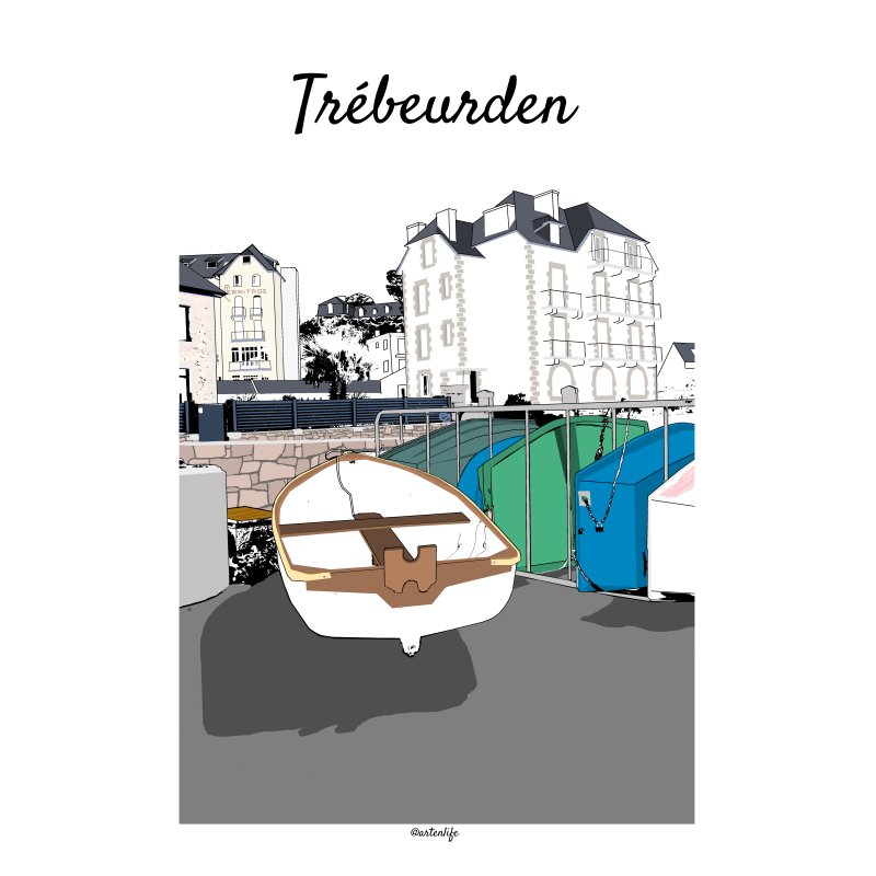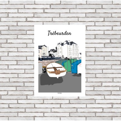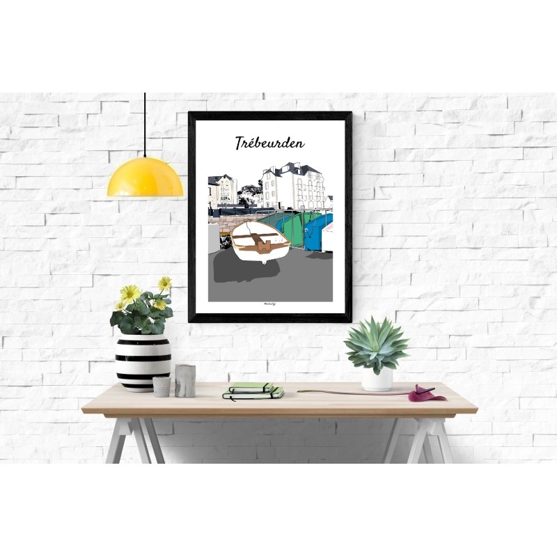 Cette affiche Trébeurden – Plage du Port met en scène une vue emblématique du front de mer de Trébeurden, au cœur des Côtes d’Armor.