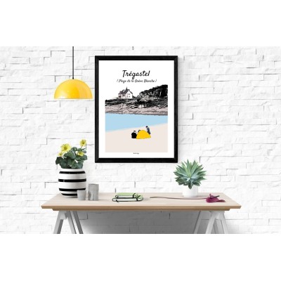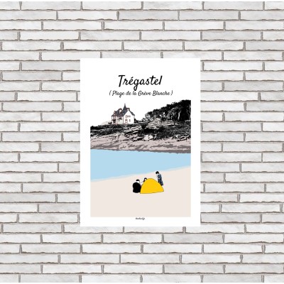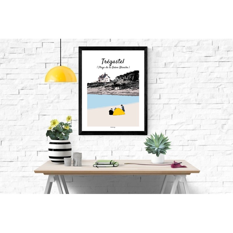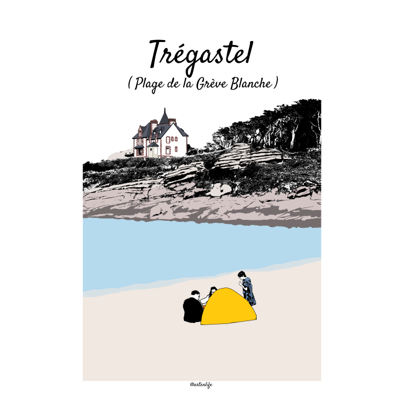 Cette affiche de la Plage de la Grève Blanche à Trégastel – met en valeur la beauté spectaculaire des falaises et rochers de granit rose. Au premier plan, une famille se détend sous une tente jaune sur le sable blanc, tandis qu’en arrière-plan, une villa de bord de mer se distingue par son toit en ardoise et ses murs en granite couleur brique. La scène illustre la douceur d’un moment balnéaire en Bretagne, entre détente et contemplation.